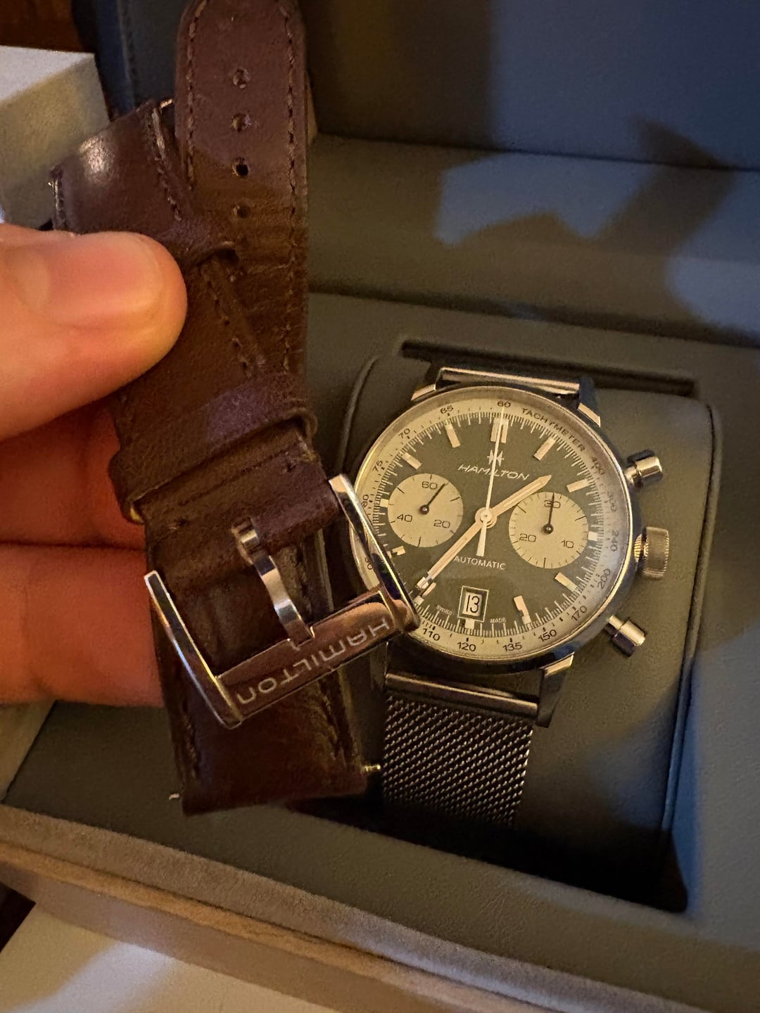 Looking to trade my Hammy! It’s a beautiful watch, it’s in great shape and runs well. I personally just have a hard time holding on to any one watch for very long! My trade value is $1300, but would consider a sale if someone is interested. Really miss my Mido TV big date if anyone is interested in trading up a bit. Thanks!