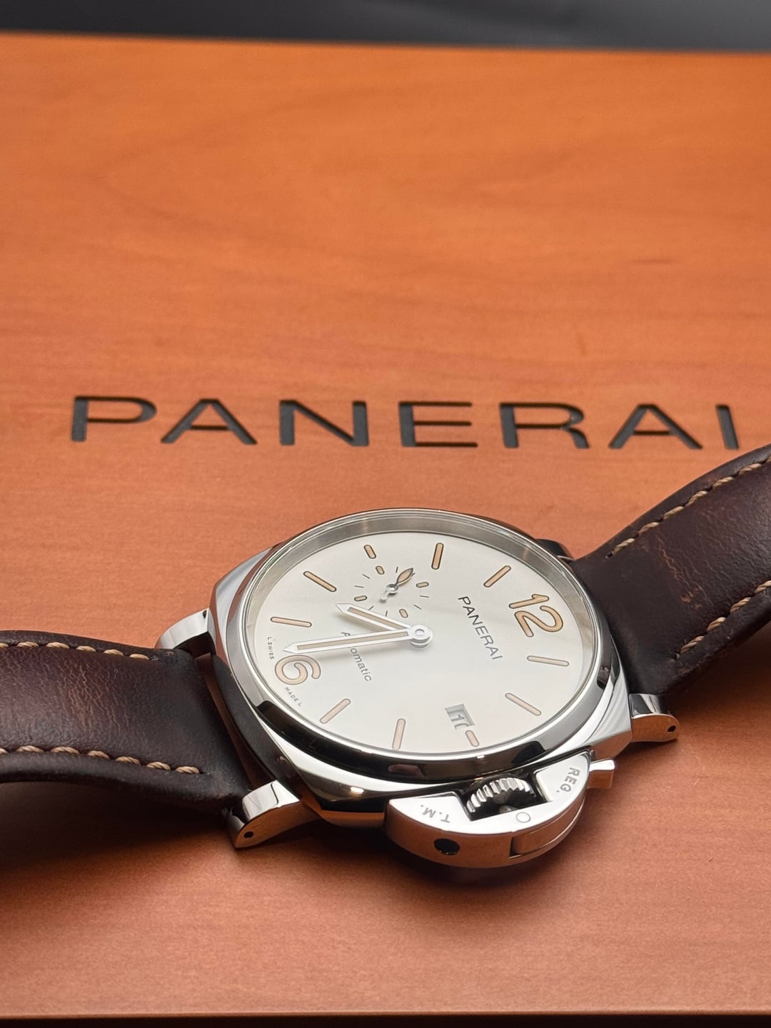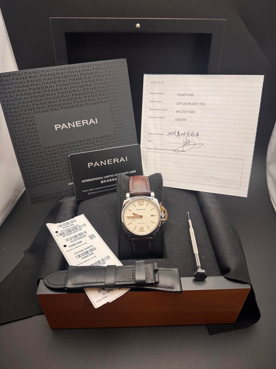 Panerai PAM01046 is 42mm which is the perfect size. It has a 72 hour power reserve and is very easy to wear on the wrist. This is the perfect watch for collectors which brings a classic Panerai look with its modern movement. I’m open to offers if this is your dream watch! Always willing to FaceTime to verify condition and answer any questions. Description below. This example presents in excellent overall condition and comes as a complete set, including an extra strap and tool. ⸻ 💰 Price $4,300 OBO + shipping ⸻ 📦 What’s Included (Full Set) • Panerai Luminor Marina PAM01046 • Inner box • Outer box • Warranty card • Warranty booklet • Papers • Sticker • Panerai strap-changing tool • Extra black strap ⸻ 📝 Condition Overall excellent condition • Crystal: Clean with no marks • Bezel: Faint handling marks visible only under bright light • Case: Very clean with sharp lines • Caseback: Two light marks near the “LUMINOR” engraving • Movement: Running strong and functioning as it should Clearly well cared for and presents beautifully on the wrist. ⸻ 🕰 Watch Details • Reference: PAM01046 • Case size: 44mm • Thickness: ~15.5mm • Case material: Stainless steel • Movement: Automatic Panerai in-house caliber • Crystal: Sapphire • Water resistance: 300m ⸻ 📍 Location & Shipping • Located in the U.S. • Fully insured shipping available • Fast, secure dispatch • Local meetups welcome ⸻ 💳 Payment Accepted • Bank wire • Zelle • Venmo • Cash (local meetups) ⸻ 🧾 About Casetowrist I’ve been buying, selling, and trading watches for 10+ years, with a focus on transparency, accurate condition reporting, and smooth transactions. Happy to meet at a local watchmaker for authentication if requested (buyer covers fee). Instagram: @casetowrist Website: Casetowrist.com Timestamp https://imgur.com/a/RYIFp9F