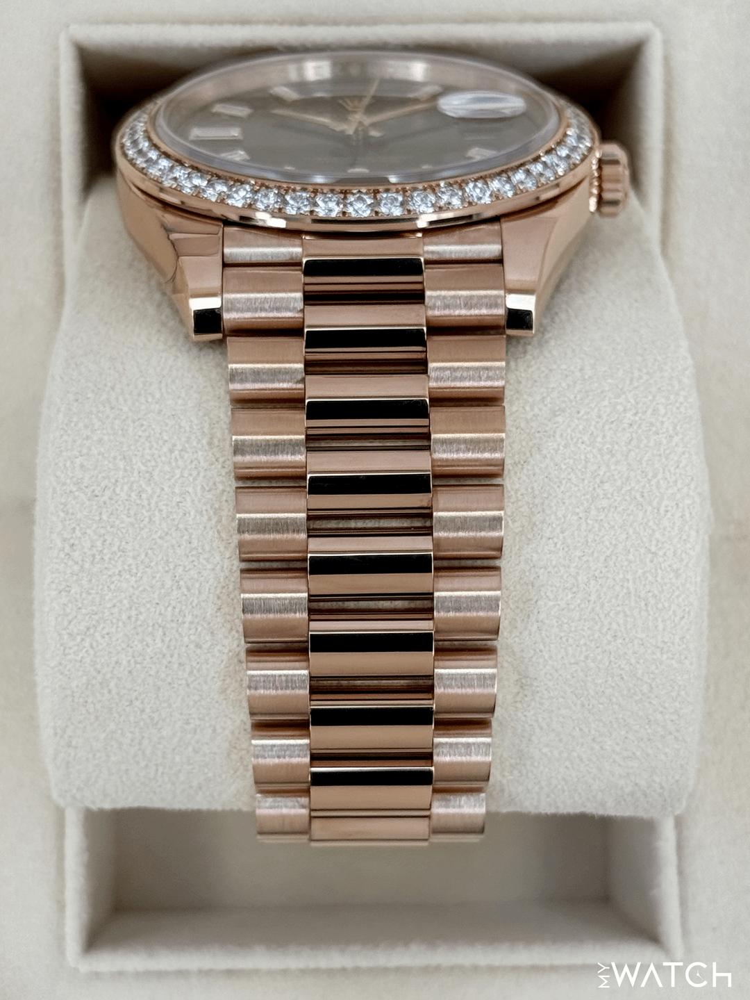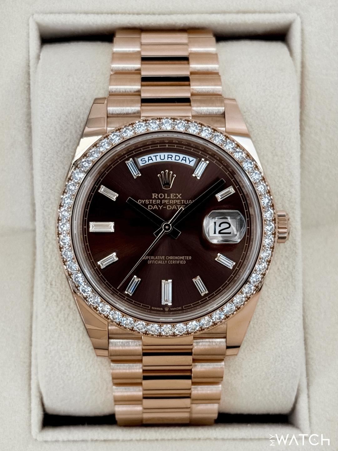 🔵**2022 Rolex Day-Date 40mm 228345RBR Presidential Bracelet 18kt Everose Gold with Diamond Set Bezel and Chocolate Diamond Baguette Dial** **🔵Note: Watch still has barcode sticker on left side of the case** 🔵**TRADE or SELL us your luxury watch, all brands considered. Message me details.** **Includes the following:** **✔️Original Rolex Double XL Boxed** **✔️Box and Papers - Yes** **✔️Warranty card dated October 2022** **✔️5 year manufacturer warranty** **✔️Manual and Warranty booklets** **✔️Green Hang Tag included** **✔️Size: 7.75inch wrist (Full Links)** **✔️Watch is in excellent overall condition. Please see photos for details.** **✔️**[**Trades**](https://mywatchllc.com/pages/sell-rolex-watch) **welcome** Business Name: **My Watch LLC** LOCATION: Oak Park, Michigan ✔️[MyWatchLLC.com](http://mywatchllc.com/) for current inventory ✔️Google Business Listing [https://g.co/kgs/Cmd6FPW](https://g.co/kgs/Cmd6FPW) ✔️Business Hours M-F 9-6 ✔️Facetime/Video chat/calls welcome to view the watch interested. ✔️Contact: 248-422-0909 via text or call for quickest response. 🟢TERMS: Visit [MyWatchLLC.Com](http://mywatchllc.com/) for payments accepted 🟢REFERENCES/REVIEWS: We are well reviewed on all platforms from google, trust pilot, rolexforums, additionally we have 300+ reference in multiple FaceBook watch groups, reference checks welcome. 🟢SHIPPING: If you are not local, we offer Fully Insured FedEx overnight shipping in the USA for a fee. International shipping available. [https://mywatchllc.com/products/2022-rolex-day-date-40mm-228235-rose-gold-eisenkiesal-baguette-dial](https://mywatchllc.com/products/2022-rolex-day-date-40mm-228235-rose-gold-eisenkiesal-baguette-dial)