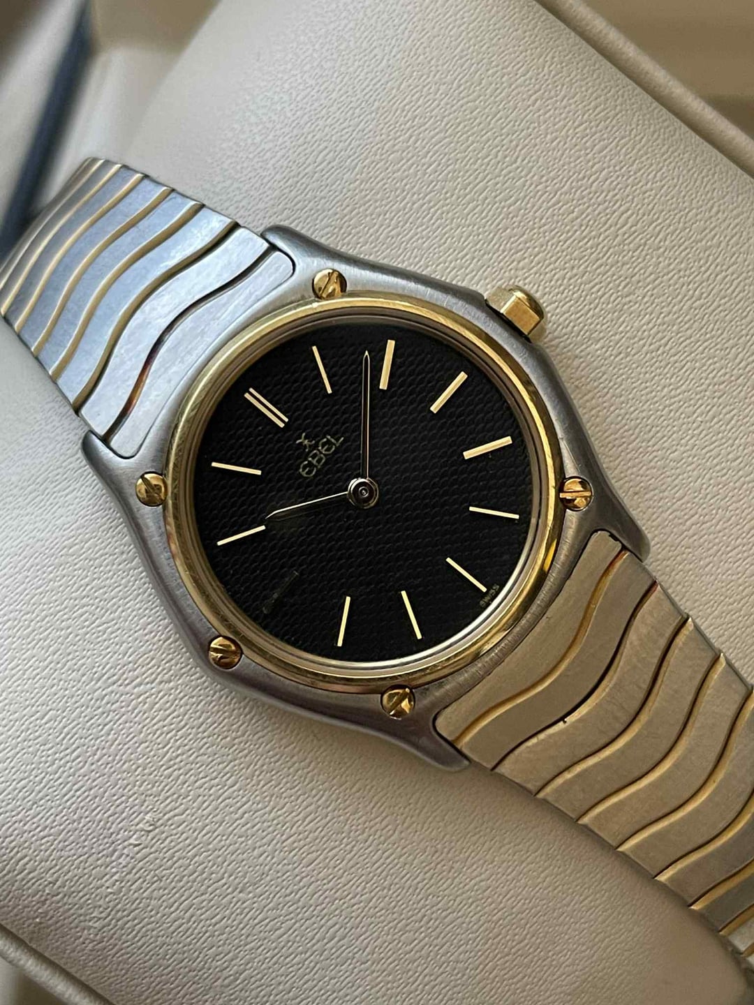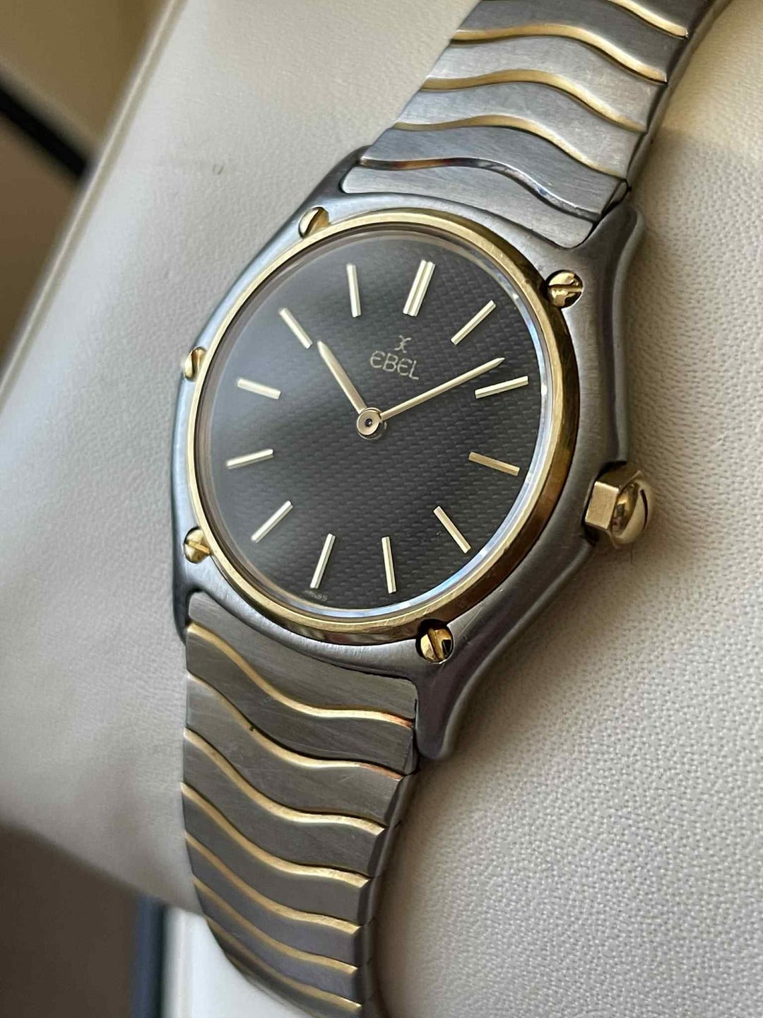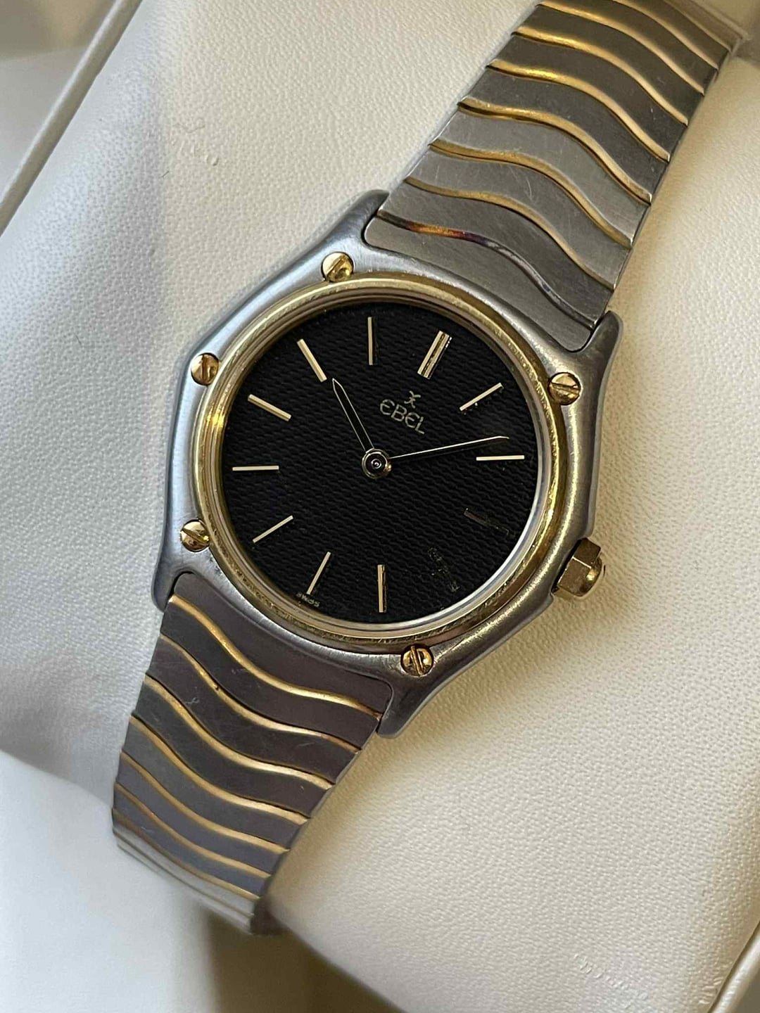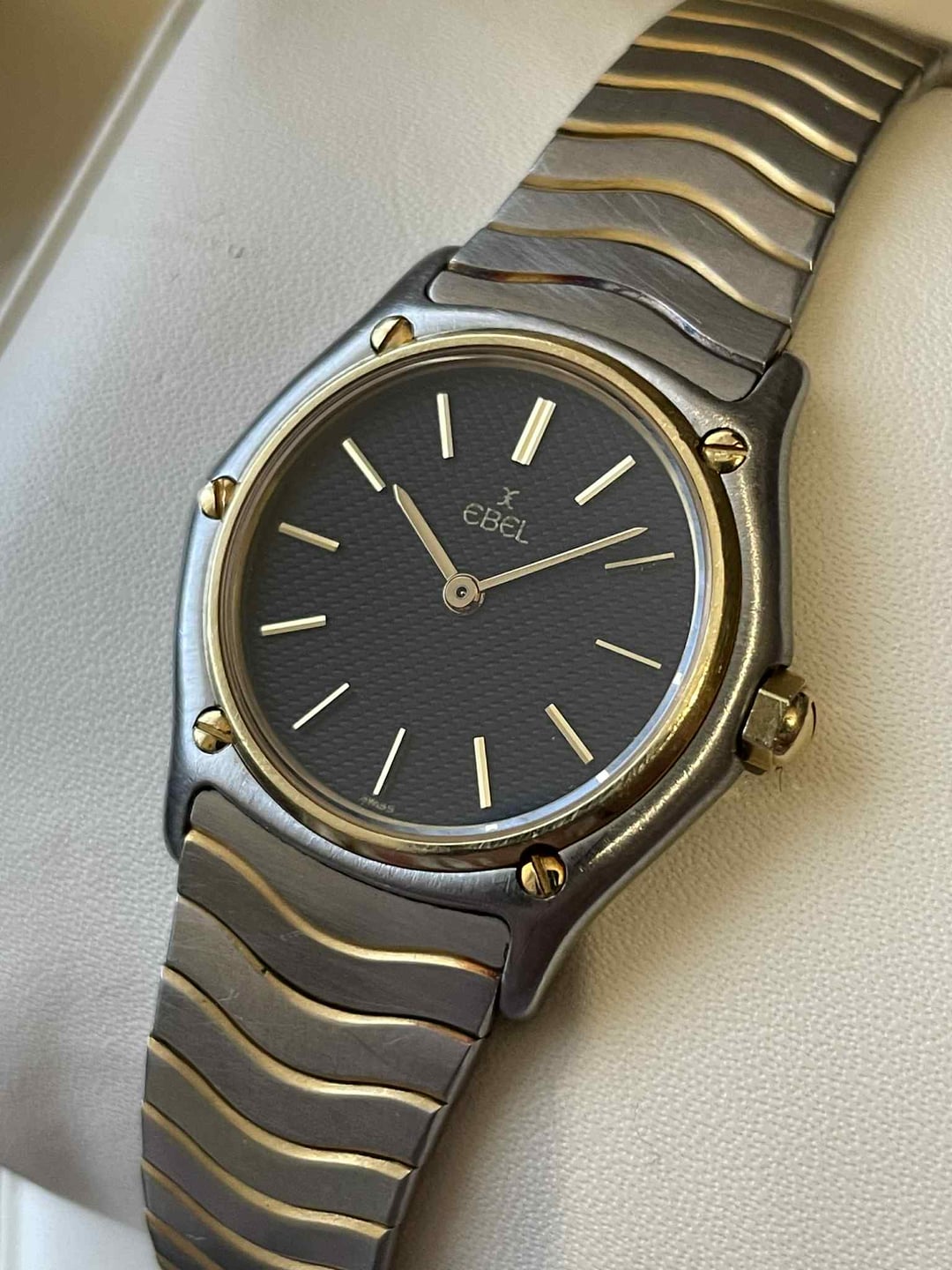 It was hard to beat Ebel when it came to design in the 80s and 90s, and this Classic Wave proves it. It features a well-proportioned 26mm case with the famous Ebel wave bracelet, and of course, an 18k gold bezel with matching screws and crown. **Condition:** Good. The case and bracelet are in good condition, but with some scratches. The links have some oxidation, but it’s hard to notice unless you look for it. The sapphire crystal is spotless. Please see the pictures for full condition and clarity. **Case Size:** 26mm stainless steel case with 18k gold bezel, screws, and crown. Thickness of 4.9mm and 14.5mm lug width. The bracelet measures 135.7mm (excluding the watch head). **Movement**: Swiss quartz. Service history unknown, but everything works perfectly. **Price:** Asking $475. Please add $25 for worldwide shipping. Payment methods include Wise, ACH transfer, Revolut, Bitcoin (On-Chain or Lightning), or PayPal G&S for buyers with solid references. Add +7.5% for currency conversion fees on the latter. Portugal has suspended all local post shipments to the US, but I can still ship with UPS ($100). US buyers may have to pay a 15% tariff on arrival. Established seller with over 220 transactions – buy with confidence! Make sure to follow me on Instagram (@daily.worn) to check out the newest additions. Happy to answer serious inquiries. No trades, no lowballs. [Pictures](https://imgur.com/a/Dok6M3o) [Timestamp](https://imgur.com/a/1FQqpTt)