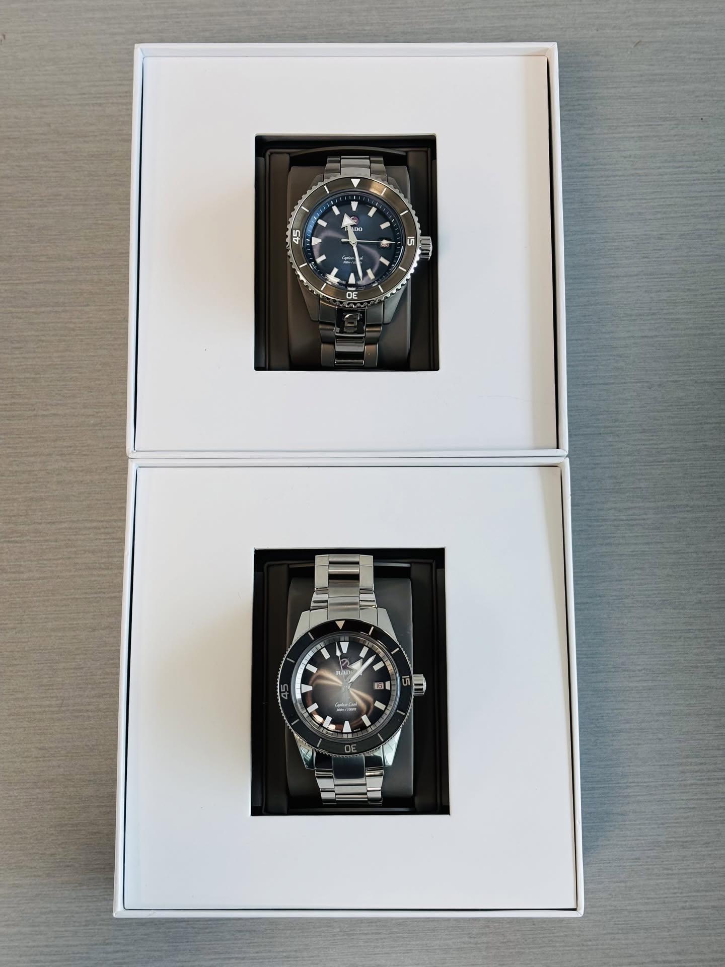 **Timestamp and album:** [https://imgur.com/a/UquBUBN](https://imgur.com/a/UquBUBN) **For sale:** Rado Captain Cook bundle consisting of two watches, one high tech ceramic and one stainless steel. Both are full sets and were purchased from an authorized Rado dealer, Aires Jewelers, not grey market. Both include active Rado factory warranties extending into 2030. This listing is bundle only and priced below individual market value. Not looking to split. **Watch 1:** Rado Captain Cook 43mm High Tech Ceramic, reference R32144202. Plasma high tech ceramic case with ceramic and titanium bracelet, blue lacquered dial with Super Luminova, Rado Calibre R763 automatic movement with 80 hour power reserve, and 300 meters of water resistance. This model is ISO 6425 certified. Like new condition with no visible wear. Full set including inner and outer box, manuals, warranty card, and all links. Warranty card dated 08/13/2025 with factory warranty valid until 08/13/2030. **Watch 2:** Rado Captain Cook 42mm Stainless Steel, reference R32105153. Stainless steel case and bracelet with unidirectional bezel and ceramic insert, black dial with luminous hands and markers, Rado Calibre R763 automatic movement with 80 hour power reserve, and 300 meters of water resistance. Excellent condition with light, normal wear only. Full set including inner and outer box, manuals, warranty card, and all links. Warranty card dated 05/30/2025 with factory warranty valid until 05/30/2030. **Price:** $2,500 shipped for both. **Shipping:** Fully insured shipping within the continental United States included. Ships promptly after payment. **Payment:** PayPal Goods and Services preferred. Buyer covers the Goods and Services fee. Will ship only to PayPal verified address. **Additional notes:** Making room in the collection. Both watches are authentic and owned by me. Factory warranties confirmed and not grey market purchases. Happy to answer reasonable questions. First clear “I’ll take it” takes priority.