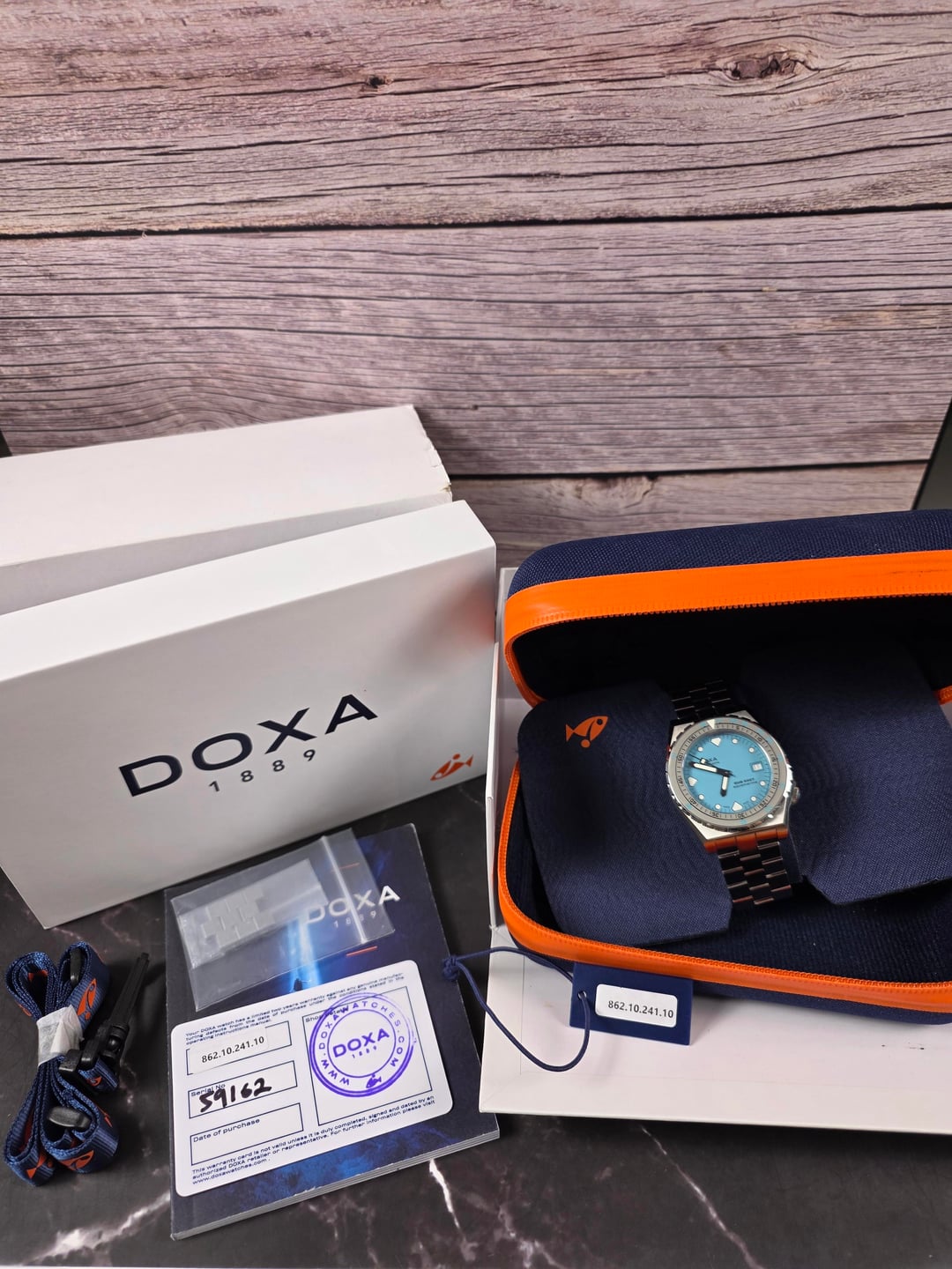 Available for Sale: Doxa Sub 600T Ref: 862.10.241.10 40mm Great overall condition • Crystal clean • Minor case wear • Minor bracelet wear • Minor clasp wear Box, booklet, hangtag, lanyard, and warranty card $1050 + label 📦 Ships from NJ (CONUS only) 💳 Zelle preferred, PayPal & Venmo FF accepted 📸 Additional photos and references available upon request
