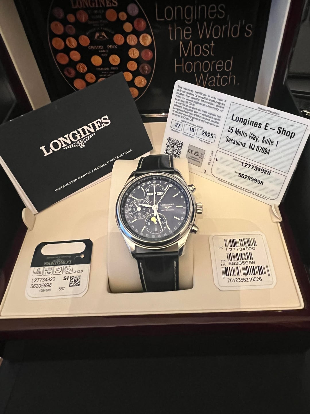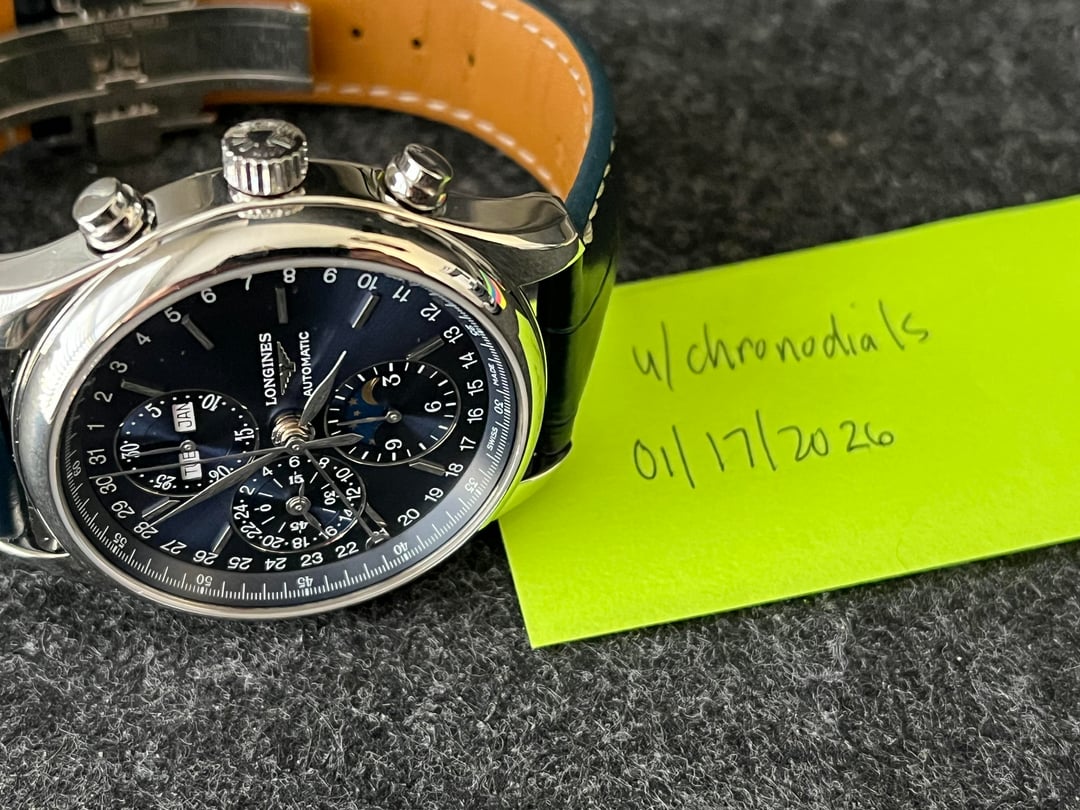 Longines Master Collection Chronograph Moonphase – Blue Dial – FULL SET Ref. L2.673.4.92.0 New AD Purchase - Dated October 27, 2025, this watch is practically new and in mint condition. There is no visible wear; the crystal, bezel, case, and leather strap are all immaculate. What’s Included FULL SET: inner & outer box Warranty card, booklets, and papers Specifications Model: Longines Master Collection Chronograph Moonphase Reference: L2.673.4.92.0 Case size: 42mm Movement: Longines Calibre L687 automatic Functions: Chronograph, moonphase, full calendar, 24-hour indicator **Price at $1999 + $36 Shipping** FIRM. Other $ Offers will be ignored. Trades see trade rule #11 below. Any perceived blemish in the pictures is either lint or reflections. Payment - Zelle, Wire, Venmo FF, or Wise (1.5% fee). Pics and timestamp in the listing Rule # 11 - Only Trades considered - greater market value - a watch frequently bought/sold here. Must receive your trade, then ship. I will tell you straight up, interested or not.
