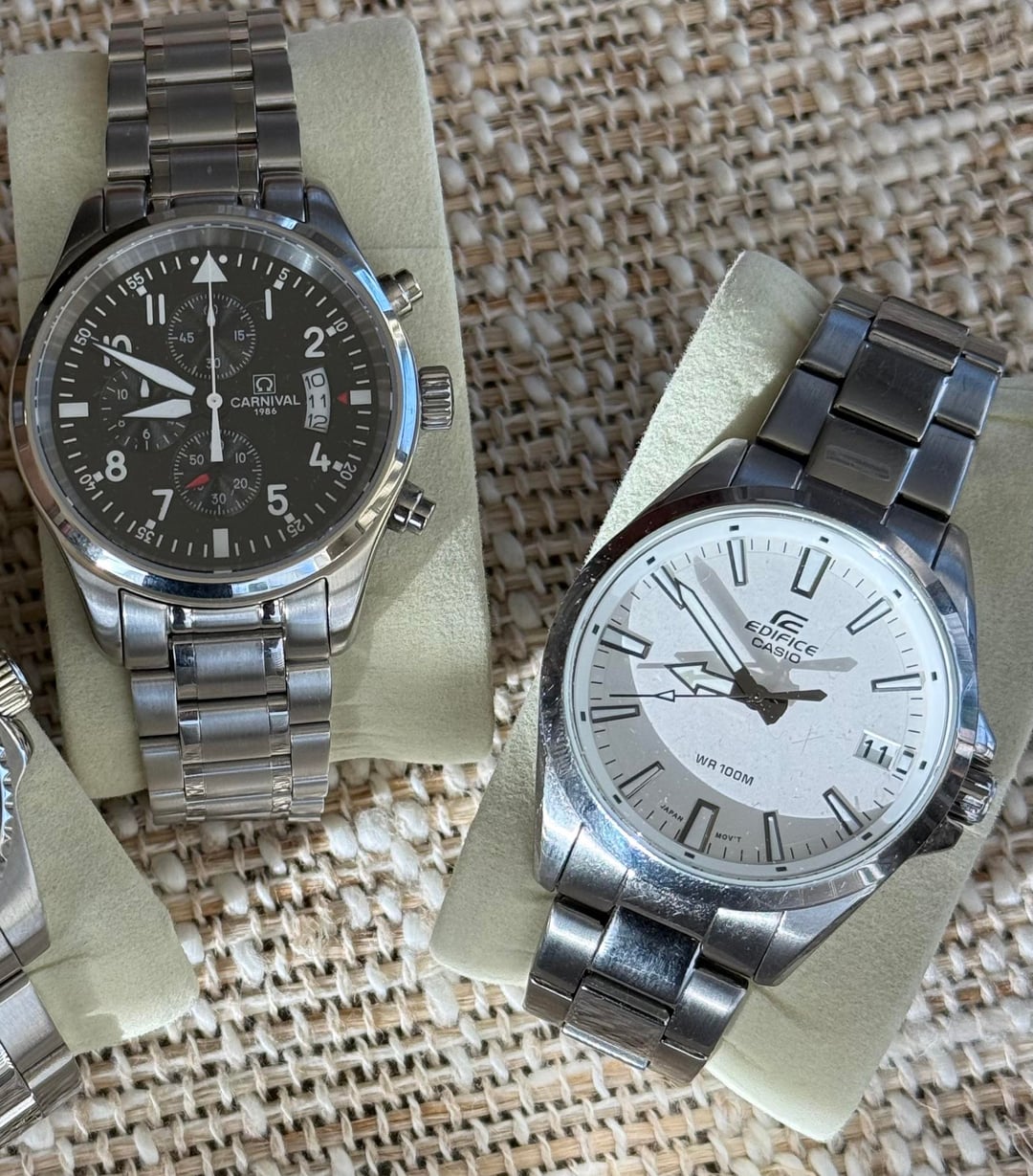I’m downsizing my collection. All well taken care of. Priced to sell, low ballers will be ignored. If any doesn’t sell, I’ll gladly keep them. That’s the excuse I need, lol. Prices Include CONUS shipping. If you need more pictures/video, please let me know **Casio Edifice White Quartz (no box) $80** **Carnival Chronograph Quartz (no box) $80** Happy to send more pictures upon request. Venmo / Zelle / PayPal