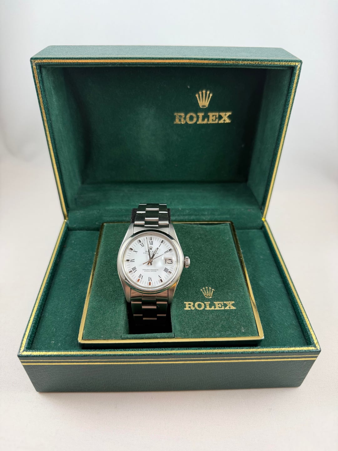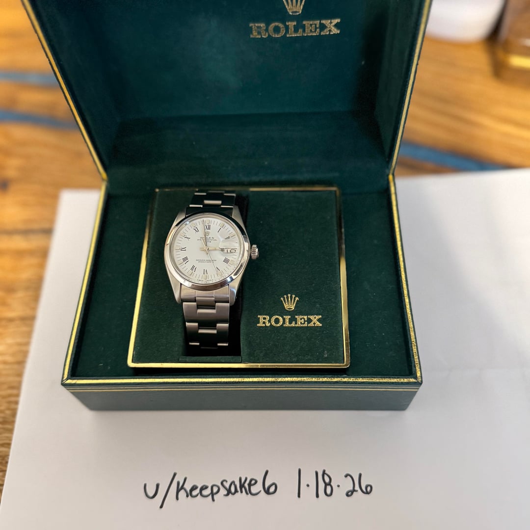 1978 Rolex Oyster Perpetual Date – Ref. 1500 - Box & Watch only. 34mm Oyster case in stainless steel with screw-down crown and caseback. Automatic Rolex movement (cal. 1570) Running at a perfect 0.0 on the Timegrapher 1/13/2026 Fits roughly 7.5 wrist. Watch is in absolutely beautiful condition. Slight scuffs on the clasp and small scratch on dial. Freshly serviced and 1 year warranty from Daved Jewelers in Ohio. Shipping from Columbus Ohio upon purchase. Willing to meet if reasonable travel.
