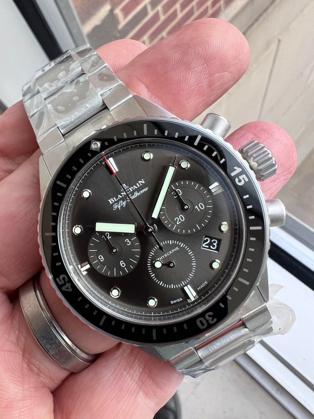 Hey Watchexchange! I’ve got a special one for you. High horology, dive flyback chronograph, tool watch vibes, and a 5 Hz / 36,000 vph El Primero style in-house Blancpain Caliber F385 movement all in one? Yes it has it all and a stunning sunburst anthracite dial too. I’m not done though. Look at that movement. Pull out your loupe boys and be weed. Condition: Unworn and still mummy wrapped. Scope of delivery: Full set with 12/2025 warranty card. Specs: Reference number: 5200-1110-71S Case size: 43mm Lug-to-lug: 49mm, 52mm with end links Case thickness: 14.8mm Water resistance: 300m Power reserve: 50 hours Price: $15,750 shipped FedEx Priority Overnight to your local FedEx Office hold location. Will ship after wire fully clears. Way under retail. Your wife won’t be mad. She’ll think you’re being prudent. Methods of payment: Bank wire only. Trades: Not at this time. References: Hundreds of successful transactions in watch trading. See my eBay account under the same name. Many references in Facebook groups, watch forums, and on WUS.