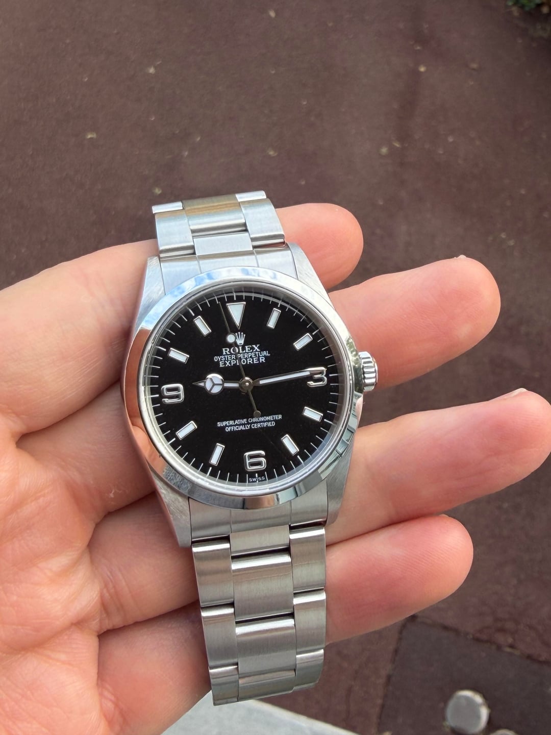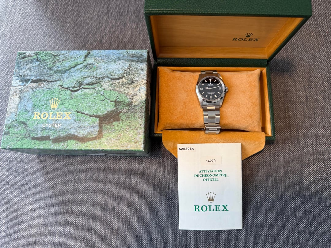 Up for grabs to today is this very nice **Rolex Explorer** (ref. 14270), which comes with box and papers from 1999. This is the special "Swiss Only" variant, which was only produced from 1999-2000. The 5 Digit explorer has a tritium dial which is also very interesting. To me, the 36mm Explorer is the perfect version of this watch, with the classic design sitting elegantly on the wrist. The proportions are perfect, and the watch can be dressed down for a Sporty look, or dressed up with formal attire. The watch comes with box and papers. The watch is in excellent condition (scratch free crystal, case, clasp). The watch was serviced approx. 12 months ago. **Price: $6,150 including free shipping.** I have been a trusted seller on Reddit since 2018, and can provide references from 700+ prior successful watch transactions. If you have any questions or would like to see a video, just let me know. Thanks!