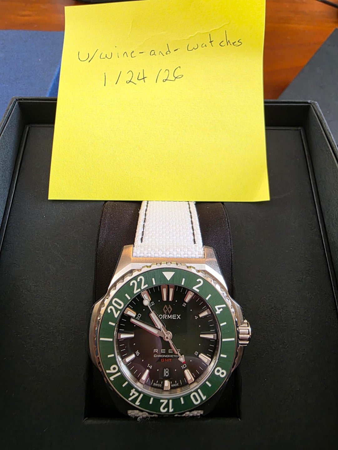 Selling a Formex Reef GMT to help cover a recent grail outchase. This is an outstanding, well-engineered GMT with excellent finishing and comfort. Price $1,500 USD + shipping Payment Accepted Zelle Venmo PayPal F&F PayPal G&S (buyer covers fees) Bank wire No trades at this time. Location Milwaukee, WI Available to meet in Chicago, IL CONUS shipping available Watch Details Brand / Model: Formex Reef GMT Dial: Green Movement: Automatic Swiss GMT (Sellita SW330-2 base) Case Size: 42mm Crystal: Sapphire with anti-reflective coating Bezel: Sapphire bezel with 24-hour GMT scale Water Resistance: 300m Lug Width: 22mm Straps: OEM white canvas strap with StrapHabit deployment clasp OEM black leather strap with StrapHabit deployment clasp Bracelet / OEM clasp: Not included Extra straphabit rubber bracelet Condition Excellent overall condition Worn lightly and carefully No notable dings or deep scratches Crystal and bezel are clean and clear Both OEM straps in very good condition Original Formex clasp not included (both straps are fitted with StrapHabit deployants) What’s Included — Full Kit Formex presentation box Manuals Warranty card OEM white canvas strap w/ StrapHabit deployment clasp OEM black leather strap w/ StrapHabit deployment clasp Extra straphabit black rubber strap Payment & Shipping Payment via Zelle, Venmo, PayPal F&F or G&S (buyer covers fees), or bank wire Fully insured shipping via FedEx or UPS at buyer’s expense Secure packaging with packing video Signature required upon delivery Seller References Disclosures Private sale; no returns unless grossly misrepresented Additional photos, videos, or wrist shots available upon request Please comment “PM sent” before messaging, per subreddit rules
