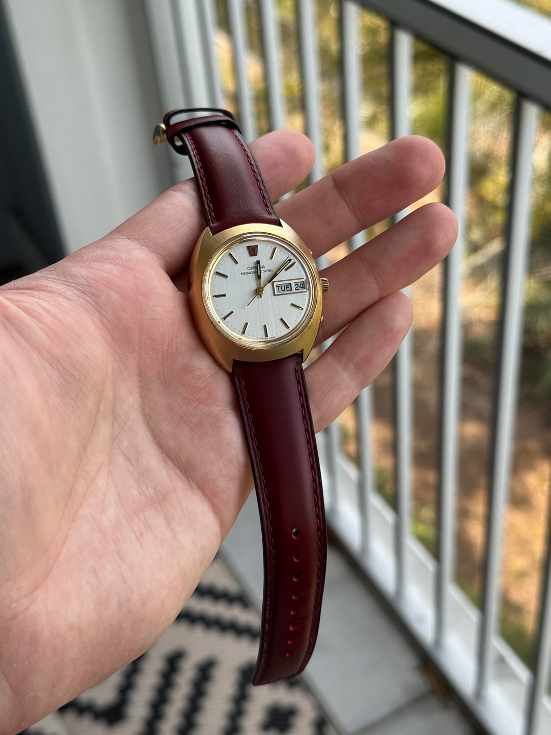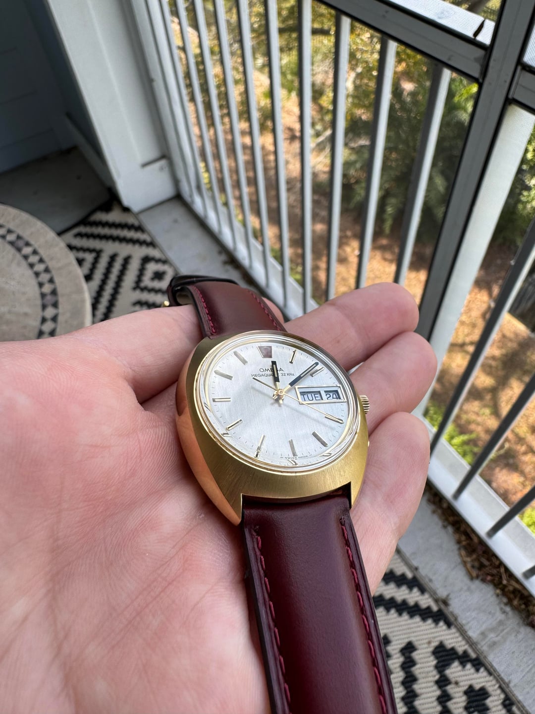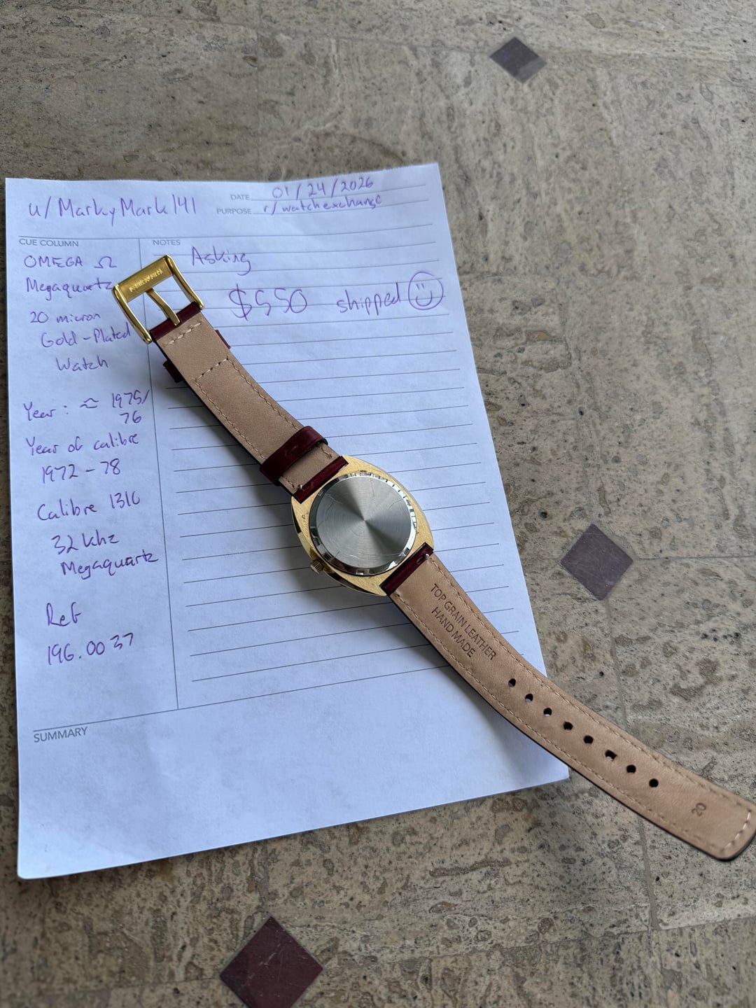 Hello watch family :) Selling a vintage Omega Megaquartz 32khz Gold Plated Watch. $550 shipped The watch is in excellent condition for its age (approximately 1975/76). It houses a vintage megaquartz module (automatic purists be damned haha!). Calibre 1310. This module was made around 72-78, and per my time checking omega forums and eBay this is the most accurate I could date it. In terms of service history and functionality, I recently had the battery replaced at a local Florida watch shop along with the gasket. Pushers are fully functional, hour and minute changes are crisp, and am happy to send a video or hop on a video call prior to purchase! I bought a nice burgundy strap to match the omega logo at the 12 o’clock position. I am looking for $550 shipped - on eBay these are priced between $540 and $1,099 - I would argue that mine is in the best condition of those listed for sale. Asking PayPal G&S/FF or Venmo. Located in Clearwater/Tampa area, am happy to meet in person if you’re local btw!