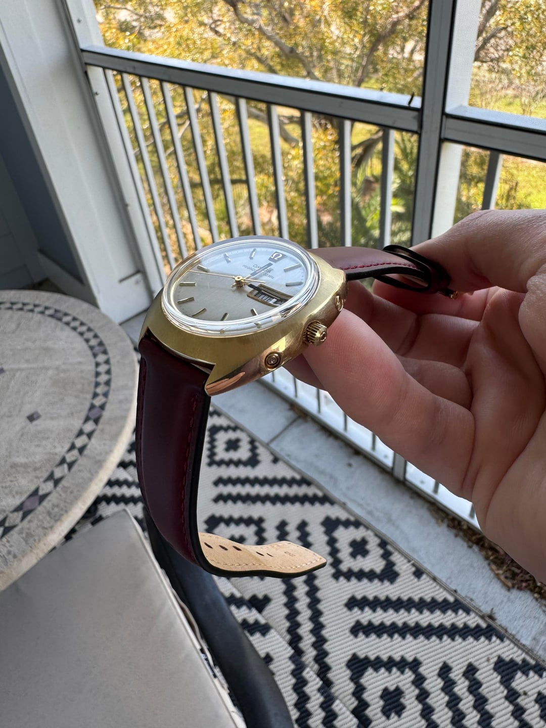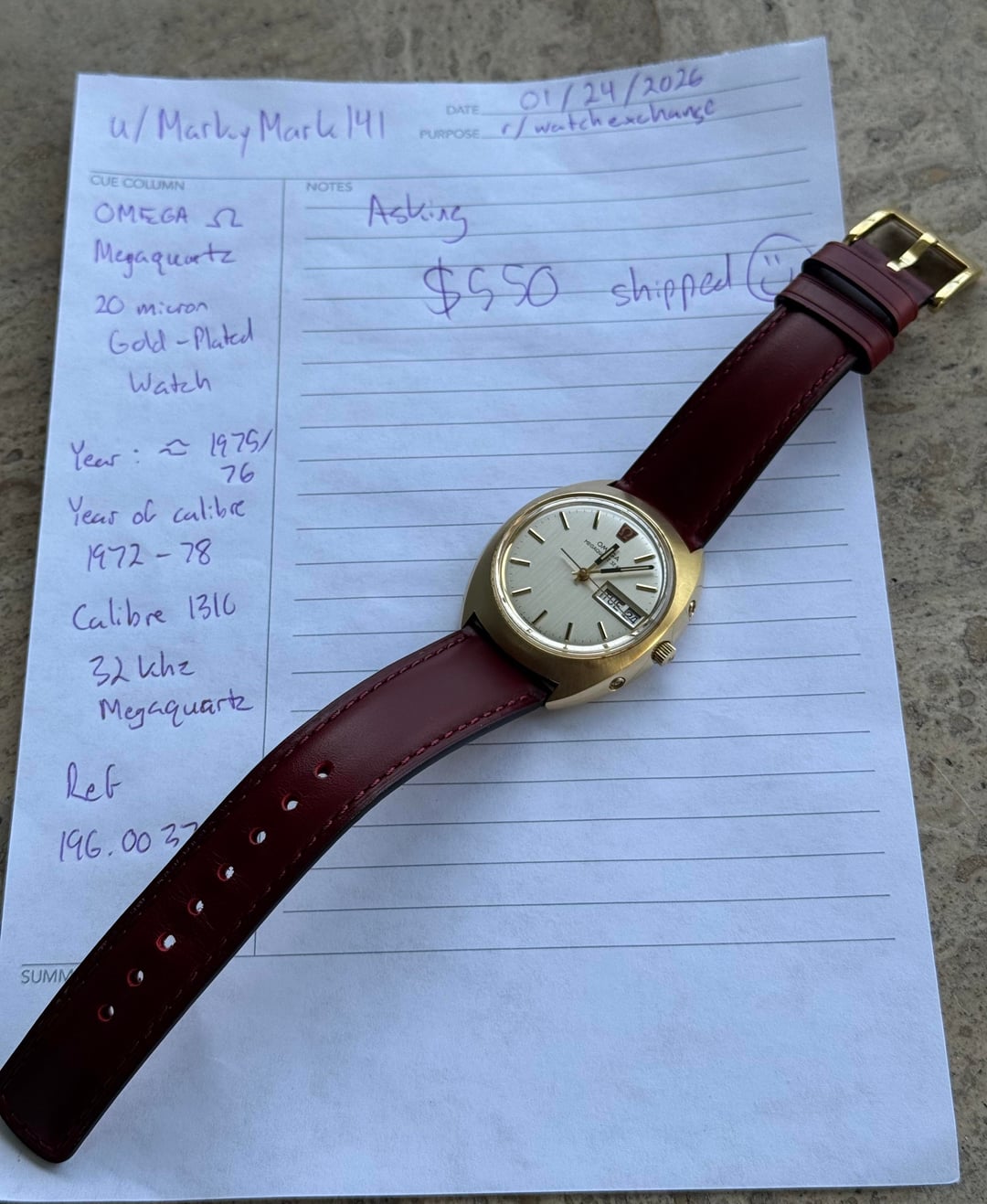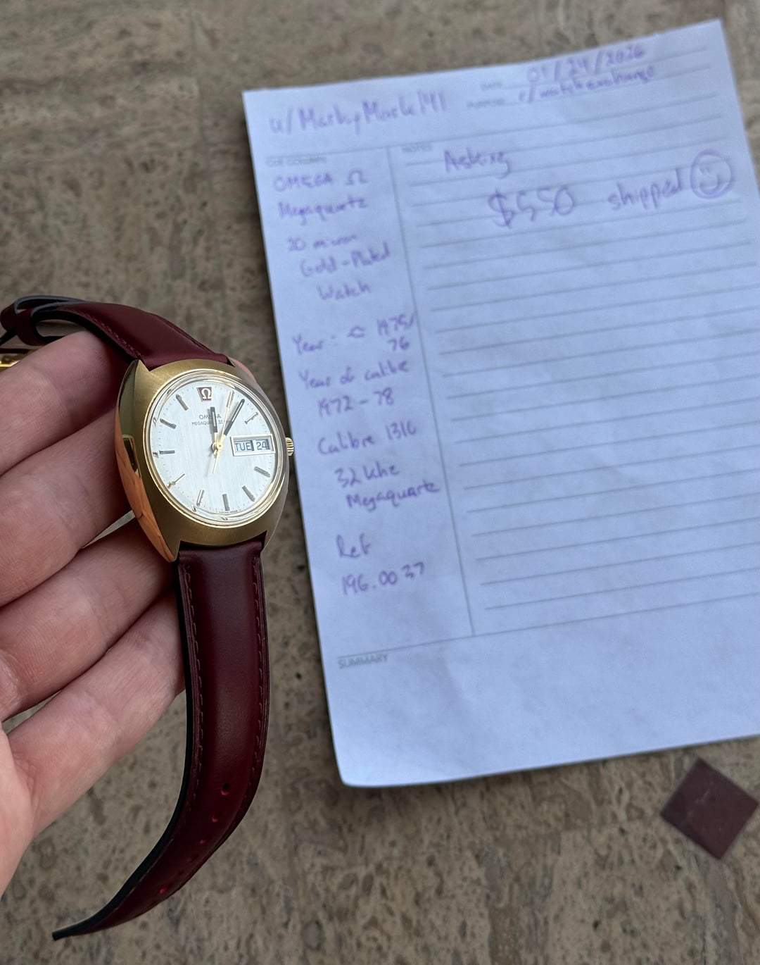 Hello watch family :) Selling a vintage Omega Megaquartz 32khz Gold Plated Watch. $550 shipped The watch is in excellent condition for its age (approximately 1975/76). It houses a vintage megaquartz module (automatic purists be damned haha!). Calibre 1310. This module was made around 72-78, and per my time checking omega forums and eBay this is the most accurate I could date it. In terms of service history and functionality, I recently had the battery replaced at a local Florida watch shop along with the gasket. Pushers are fully functional, hour and minute changes are crisp, and am happy to send a video or hop on a video call prior to purchase! I bought a nice burgundy strap to match the omega logo at the 12 o’clock position. I am looking for $550 shipped - on eBay these are priced between $540 and $1,099 - I would argue that mine is in the best condition of those listed for sale. Asking PayPal G&S/FF or Venmo. Located in Clearwater/Tampa area, am happy to meet in person if you’re local btw!
