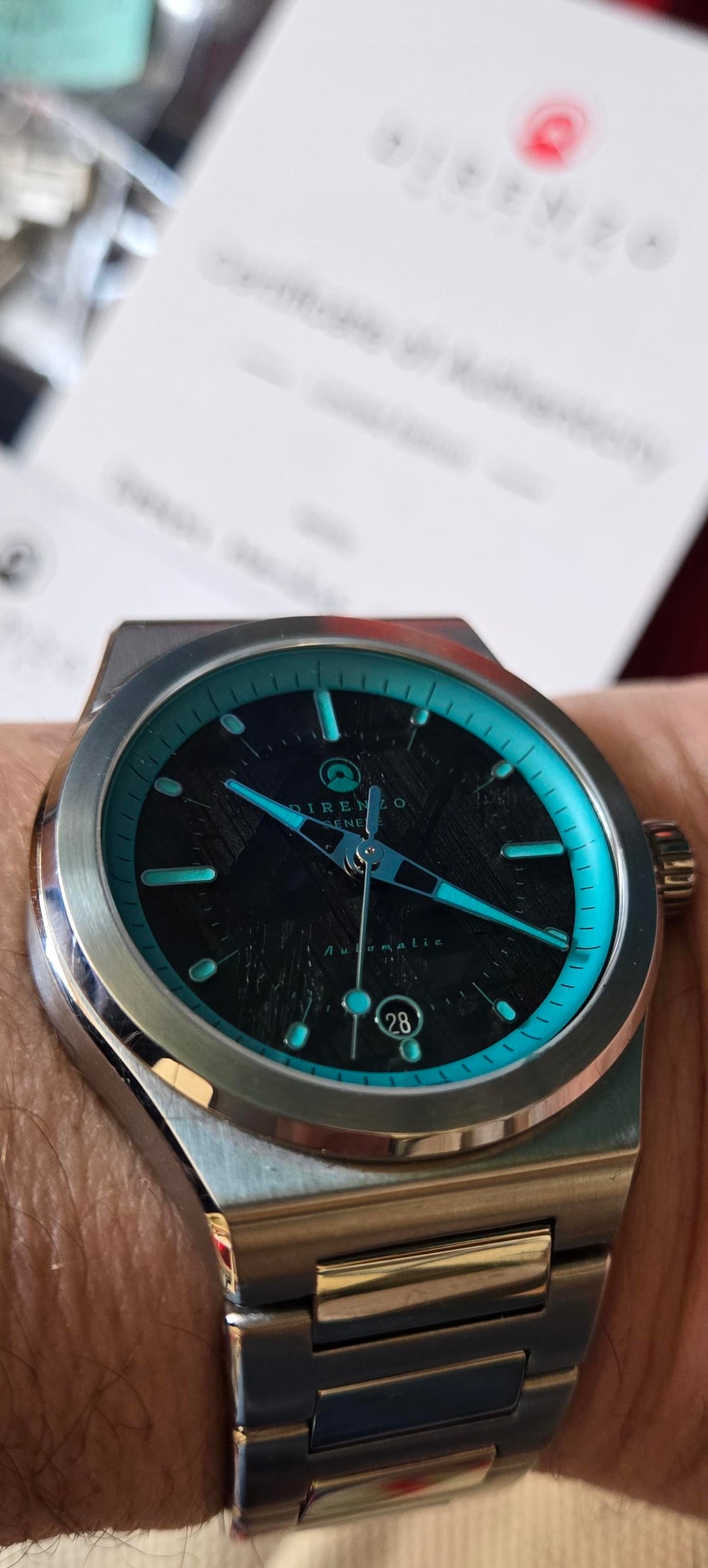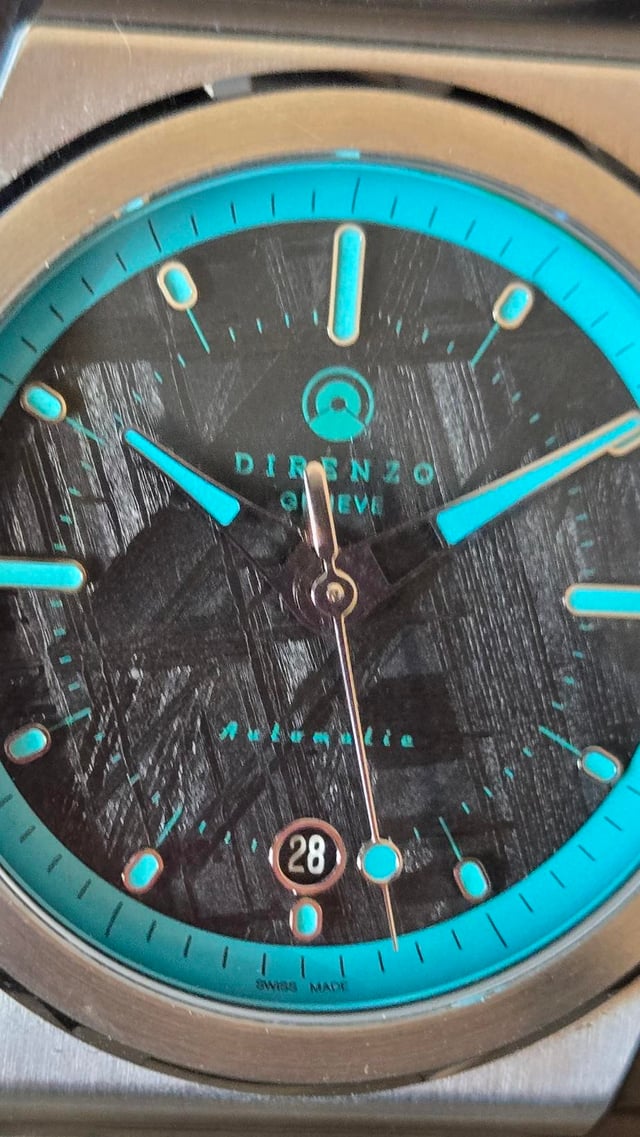 **Now at a Lower Price** Greetings: Beautiful Direnzo DRZ 04 Mondial with unique Meteorite Dial. Released in 2023 and long sold out. Swiss Made quality microbrand. This watch is in excellent condition. It's a rare find, a limited edition. Only 60 ever made. Full Kit includes a turquoise Mondial rubber strap. Asking **$1100** shipped CONUS. International buyers pay shipping. Local San Francisco Bay Area pickup is ok. PayPal F&F. Add 4% for G&S. No trades please. Thanks! From my personal collection. Selling to thin the herd. Here are the specs: |Bracelet|Metal bracelet with butterfly clasp| |:-|:-| || ||| ||| |Diameter W/0 crown|40mm| |Lug to Lug|48mm| |Height|10.8 mm including sapphire| |Water resistance|10 atm| |Movement|Sellita SW-200-1 Elaboré + Incabloc| |Caseback|Screw down with sapphire crystal| |Weight|150gr. with bracelet (all links)|