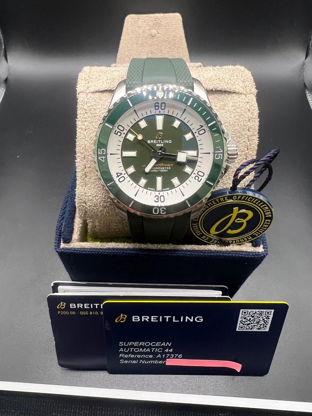 **F/S: 2025 New Breitling Superocean 44mm Green A17376 (A17376A31L1S1)** **Specs:** \* Beautiful matte green dial w/SS green bezel with a sliver flange with minute scale \* Automatic self-winding \* 44mm \* SS case with green rubber strap/ SS folding micro adjust clasp \* 300M Water Resistance \* 38-hour power reserve \* B17 (COSC) movement **Includes**: Watch, box, warranty card 2025, travel roll, booklet and tag. **Condition:** New, Unworn, stickers on the case. There are a few hairlines on the polished center of the clasp from handling. Strap is uncut. **Price: $2,999.00 Firm + Insured shipping to your local FedEx for pick-up in Con US**. I am also open to a face-to-face public transaction in or around the Tampa Florida Region, within reason. I have many strong and viable references within Reddit and from Buy/Sell/Trade Watch Facebook groups. Always willing to jump on a call or meeting link to show you the watch. Thank you and please reach out if you have any questions or concerns. Florida residents may be subject to sales tax w/o a valid resale cert. ***No Trades, TY*** **Location**: Tampa Florida **Payment:** Zelle or Wire Timestamp: [https://imgur.com/a/zwrO3nk](https://imgur.com/a/zwrO3nk) FB: Watch Therapy Timepieces IG: [@watchtherapy4u](https://www.reddit.com/u/watchtherapy4u/)