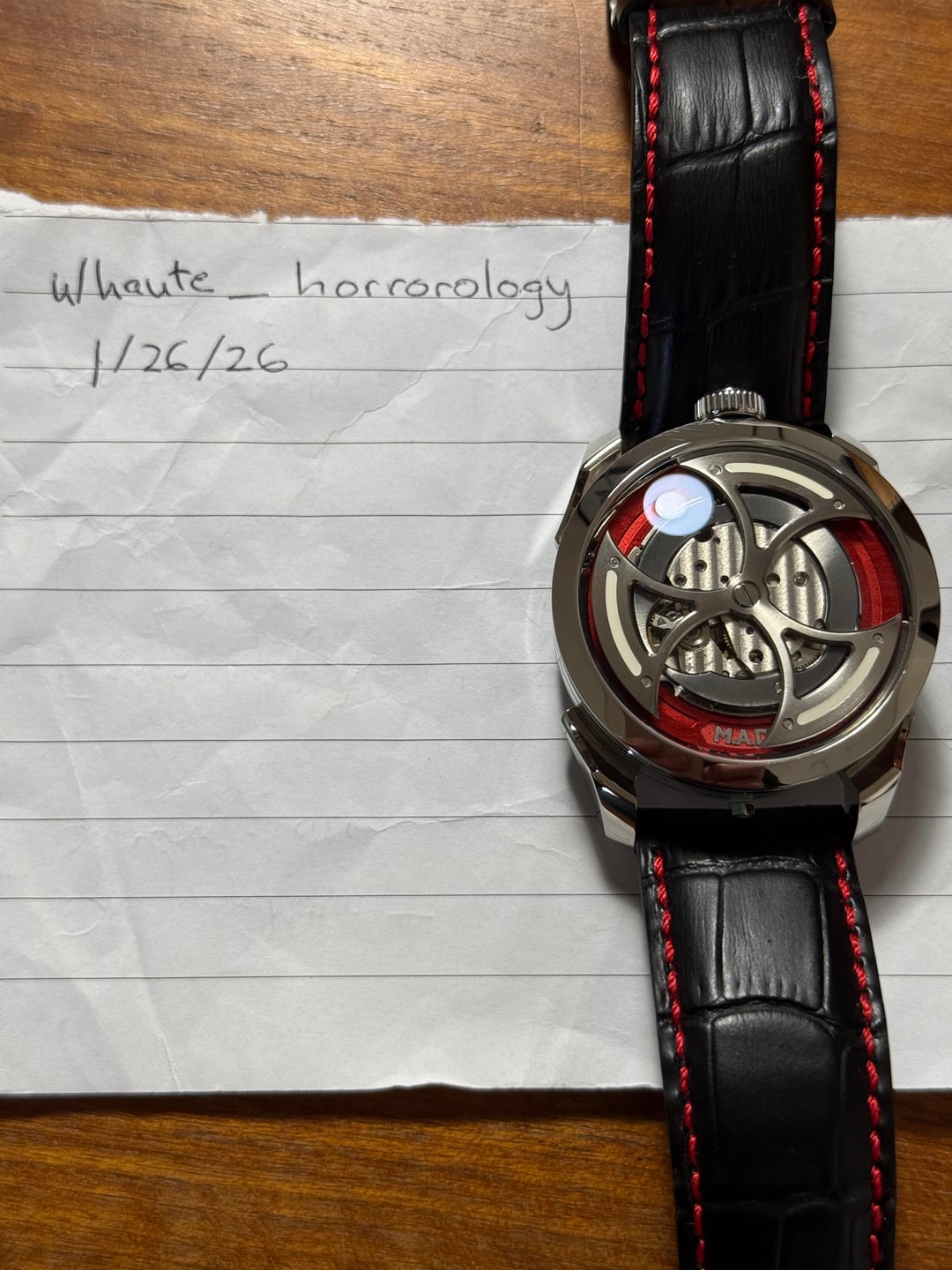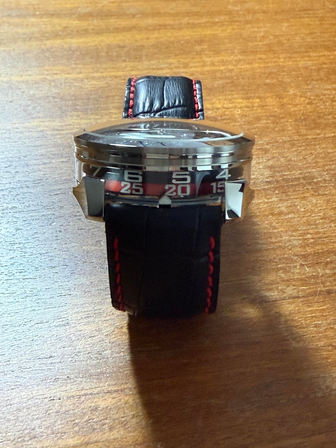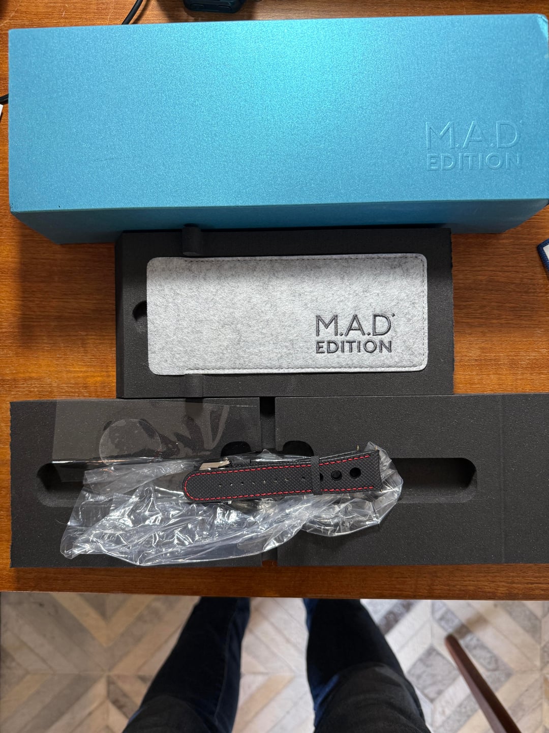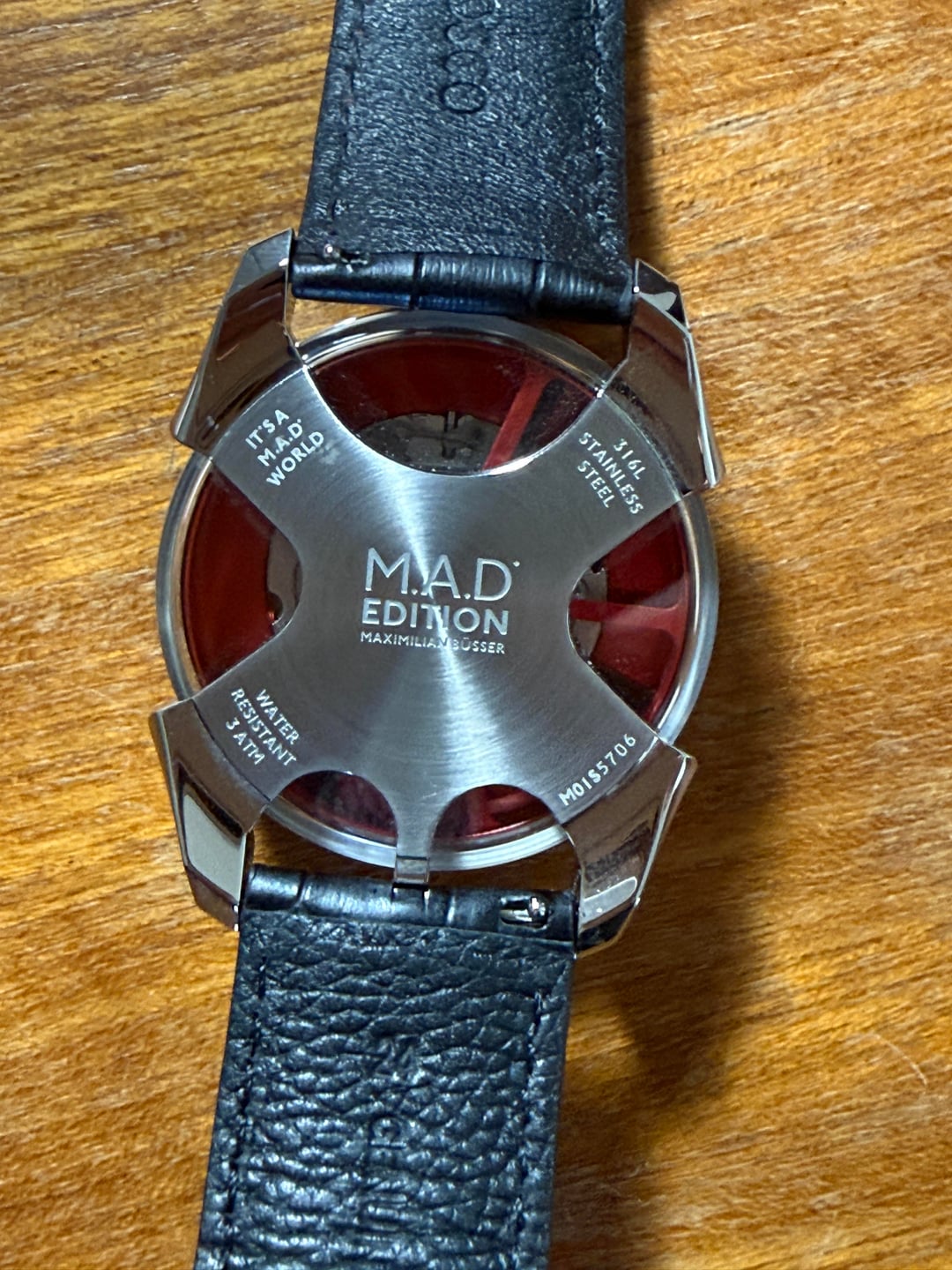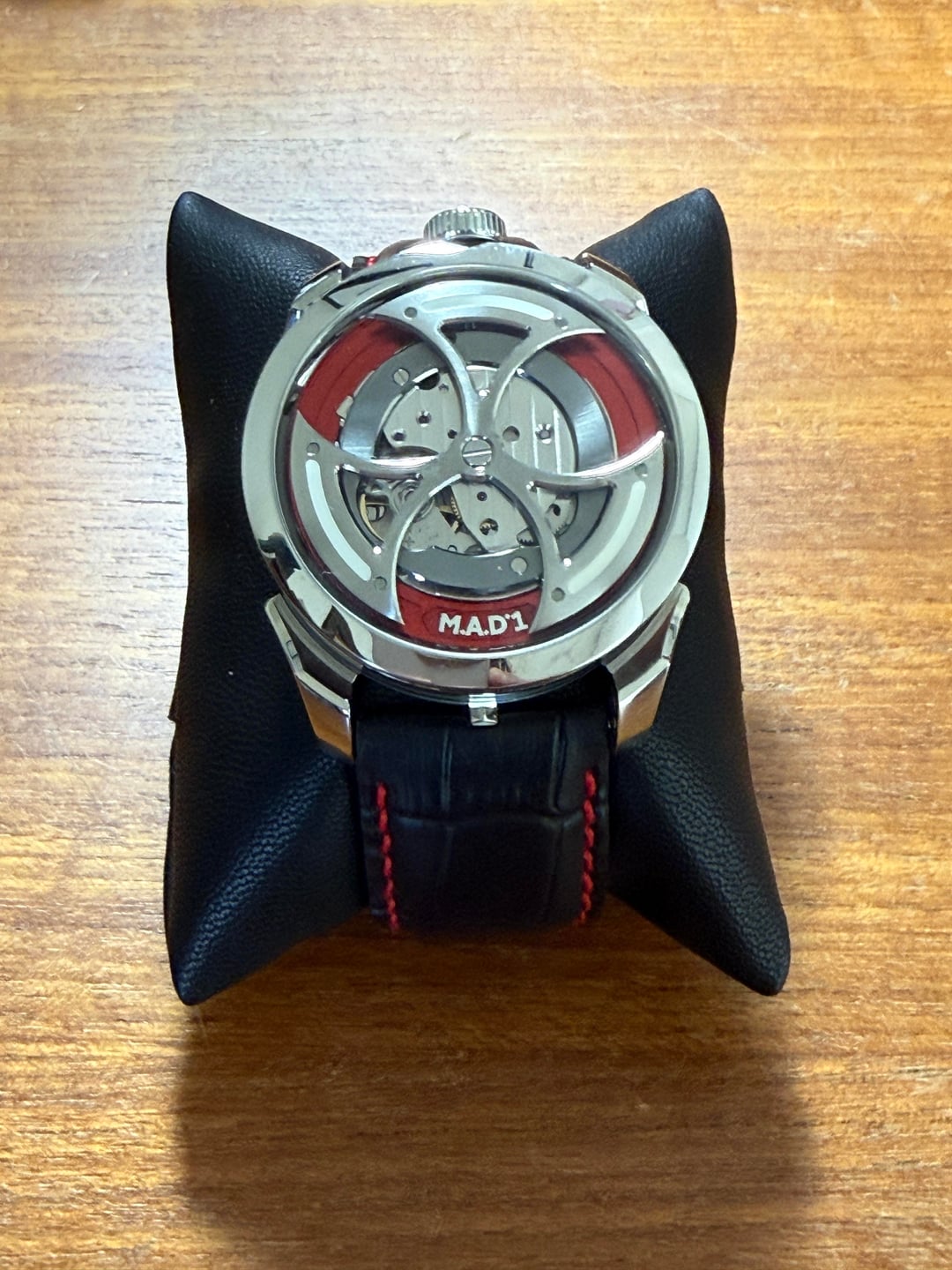 One of the coolest watches out there and a trailblazer in the independent watch scene! For sale is my MB&F M.A.D. 1 Red in like-new condition. It comes as a full set with two extra straps. I cannot see any real marks anywhere, but there could be slight ones on the bezel and near the lugs from winding and strap changes, respectively (I don't want to misrepresent the watch as unworn although it is almost in that condition.) While I have worn the watch almost entirely on non-OEM straps, I did put an extra notch in the OEM strap for my 6.9" wrist. I probably cannot tell you anything about this topsy-turvy whirligig of a watch that you don't already know. It is the most playful piece in my collection and a guaranteed conversation starter. It is one of my favorite pieces to watch in action as it never seems at rest. It is also surprisingly legible: the driving watch orientation of the discs makes it quick and easy to read the time. The only reason I am releasing this piece is that I recently acquired the OG M.A.D. 1 Blue. I couldn't see keeping two of them around! **PRICE: $3600**. Price is pretty firm. I am happy to chat with you prior to purchase for piece of mind (or to see the watch!) PayPal, Zelle, and Venmo work for me - I would prefer F&F, but G&S is fine (buyer pays). US shipping only unless buyer makes special arrangements. Happy looking!