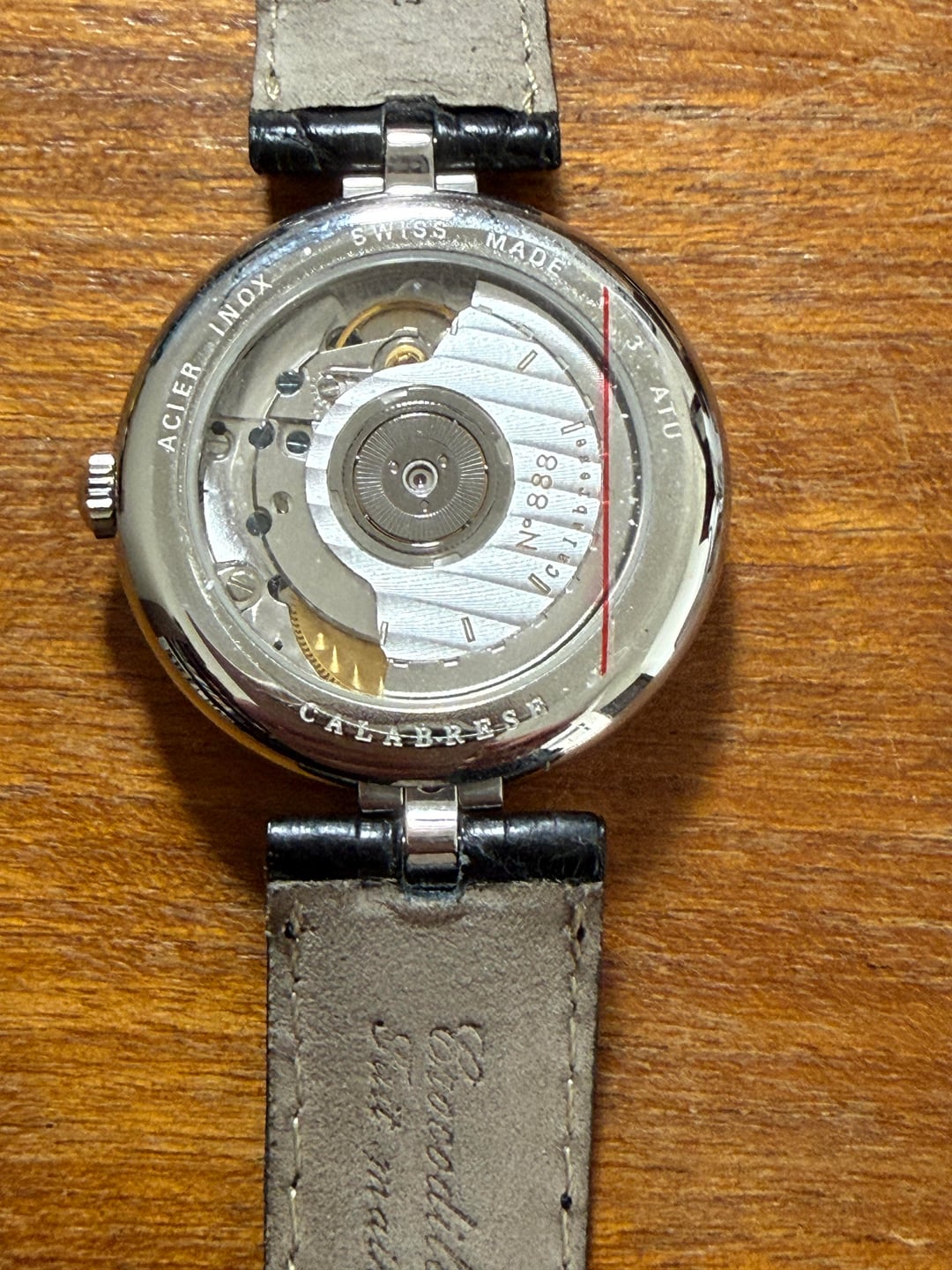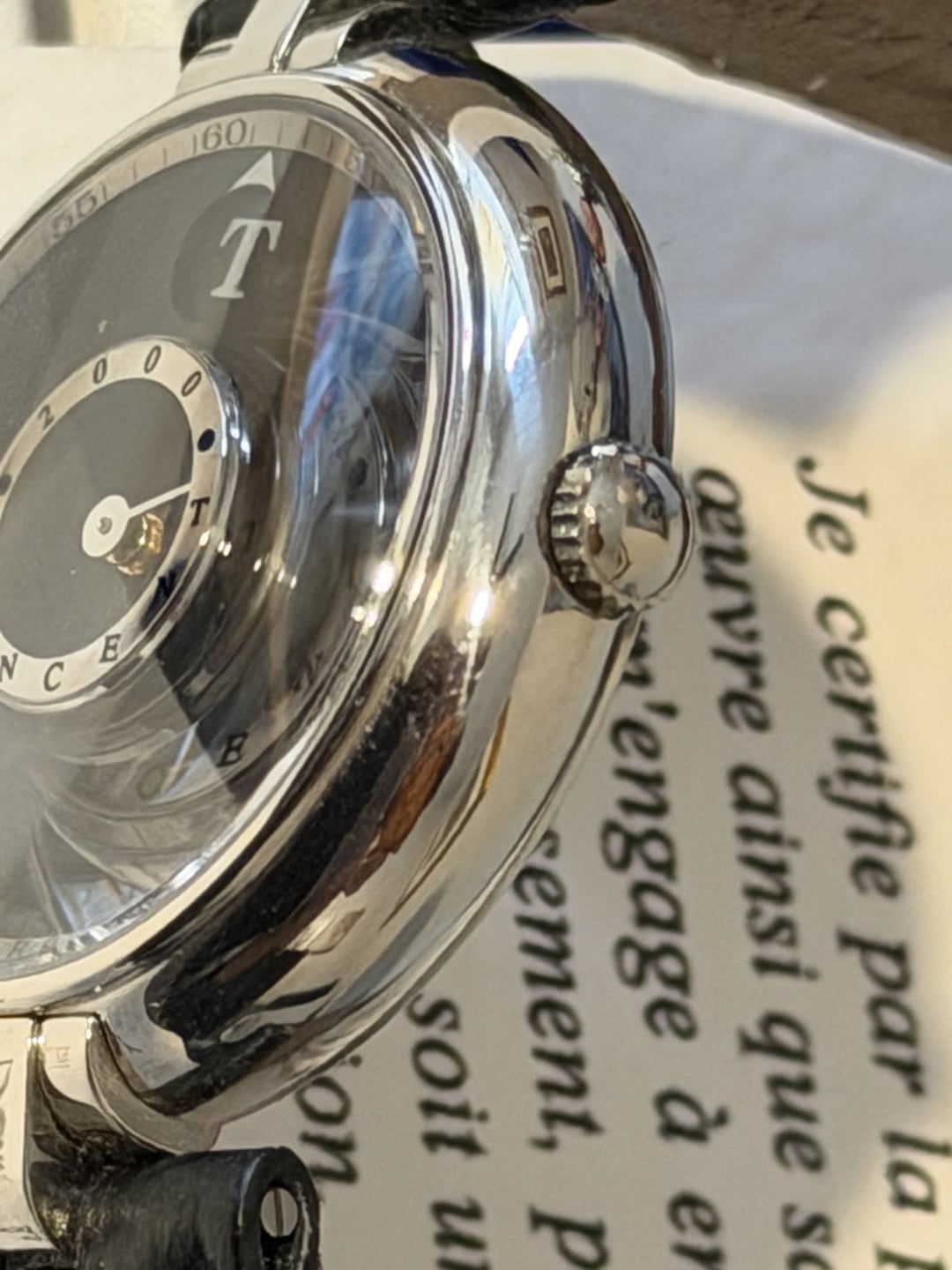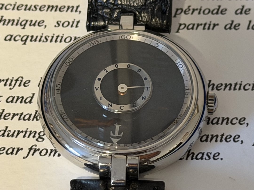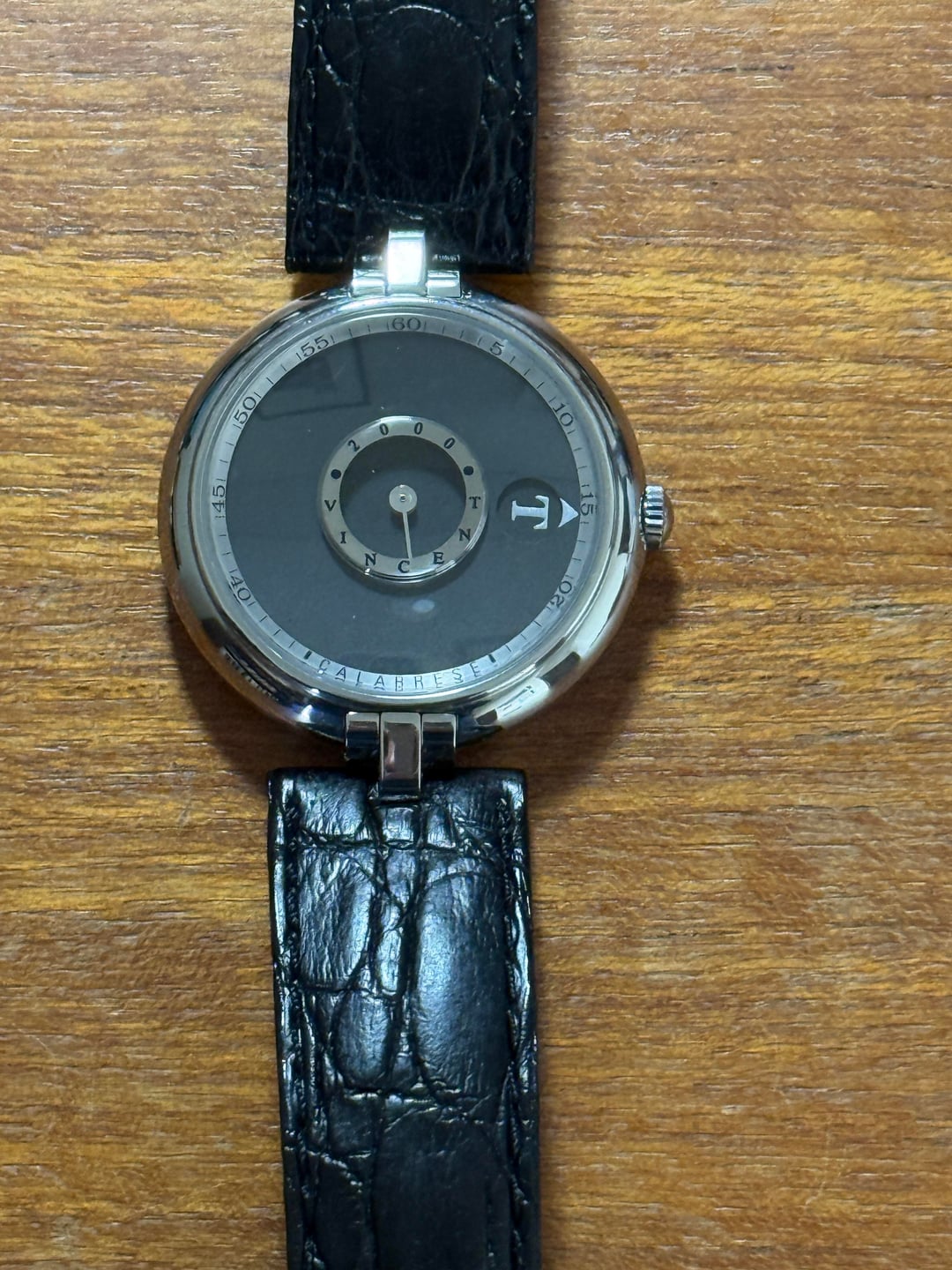 You will not see one of these very often... Up for sale is my ultra-rare Vincent Calabrese Vincent from 2000. It comes as a full set in like-new condition - the plastic is still on the exhibition caseback. There are only the lightest of swirls on the polished case (mostly from moving the watch in and out of a safe); it has only been worn a handful of times. It is running strong and accurately. We all know how popular wandering and jumping hours are right now. Vincent Calabrese, co-founder of the AHCI, created one of the earliest production models and has become synonymous with the wandering jumping hour complication. This version, Vincent (named after himself and a pun on the year 2000, or vingt cents in French) is also a predecessor of his successful Ottica line. He introduces the "optical illusion" of a disappearing dial using the curve of the glass and polished surfaces. The indices disappear as you tilt the watch past 60 degrees. The watch is unbelievably playful and impeccably executed. It is truly haute horology at a reasonable price. The deco vibes are also wonderful on this 36mm piece. The single lug and the unusual strap give it a vintage, elegant feel. The case almost has a disco volante feel. It is a sight to behold. I am only letting this one go because the 36mm is a little small for me, and I would like for this piece to be worn and loved. Also, I have another Calabrese wandering jumping hour, so I won't feel like I am missing out too much without it. **Price: $4250.** I accept PayPal, Venmo, or Zelle. F&F preferred, but G&S is fine (buyer pays). I would prefer a US sale, but I am happy to discuss international shipping. I am always happy to chat with prospective buyers. Thank you for looking!