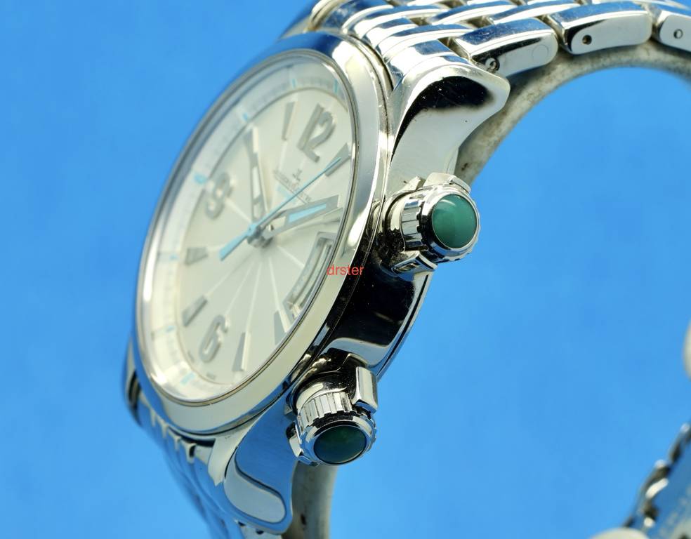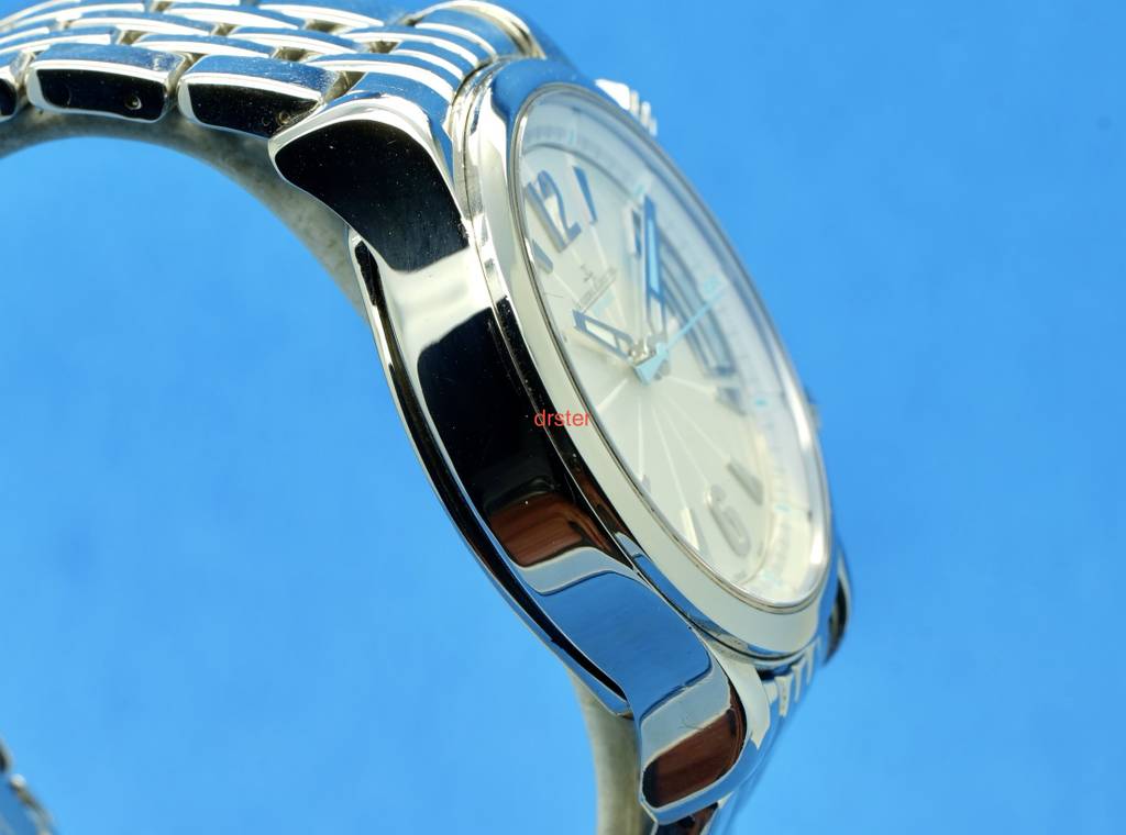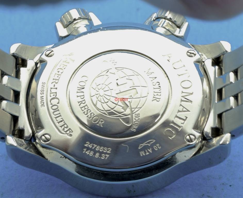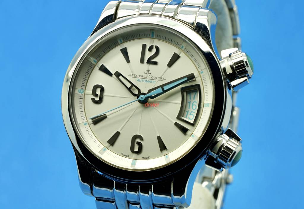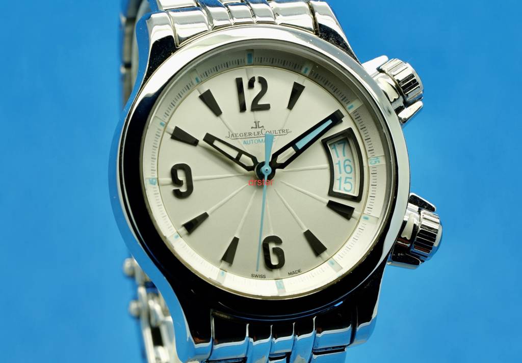 For sale (or trade) is my Jaeger LeCoultre Master Compressor in Stainless Steel Reference 148.8.37. It is about 36 mm in diameter. It features the JLC in house cal. 899 movement. The dial is silver with turquoise accents. The second crown is for the inner rotating bezel. Water resistant to 200m. It is in excellent condition. Keeps excellent time. No issues.