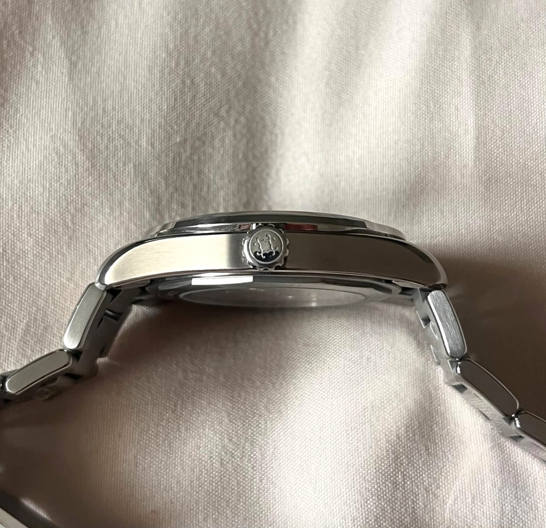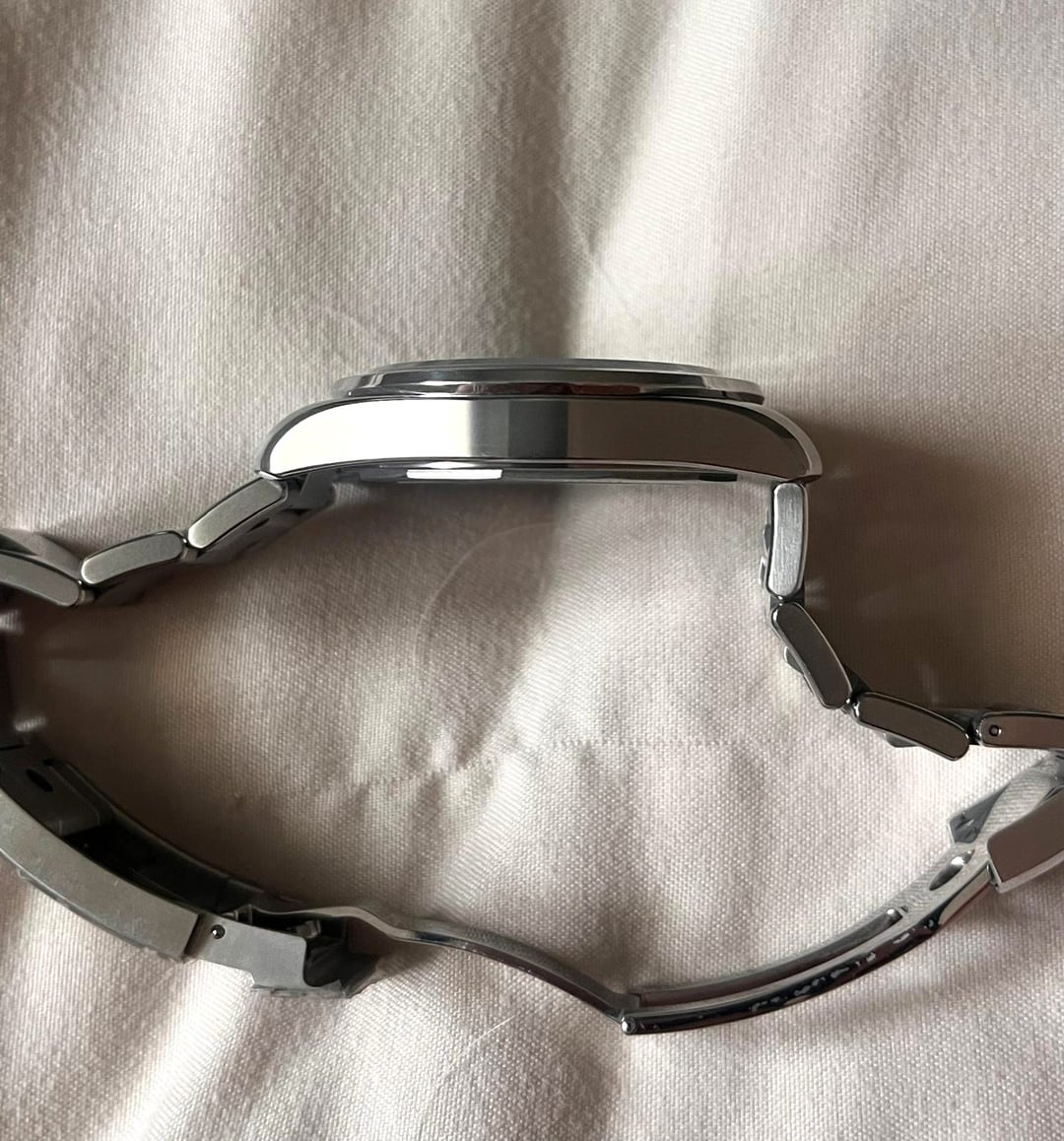In very good condition, minor wear on one side of the bracelet and a small hairline on the bezel between 4 and 5. I tried depicting them on the pictures. However on wrist the watch looks great and the details are not immediately visible. Sides of the case and crystal are perfect (like shown in pictures).