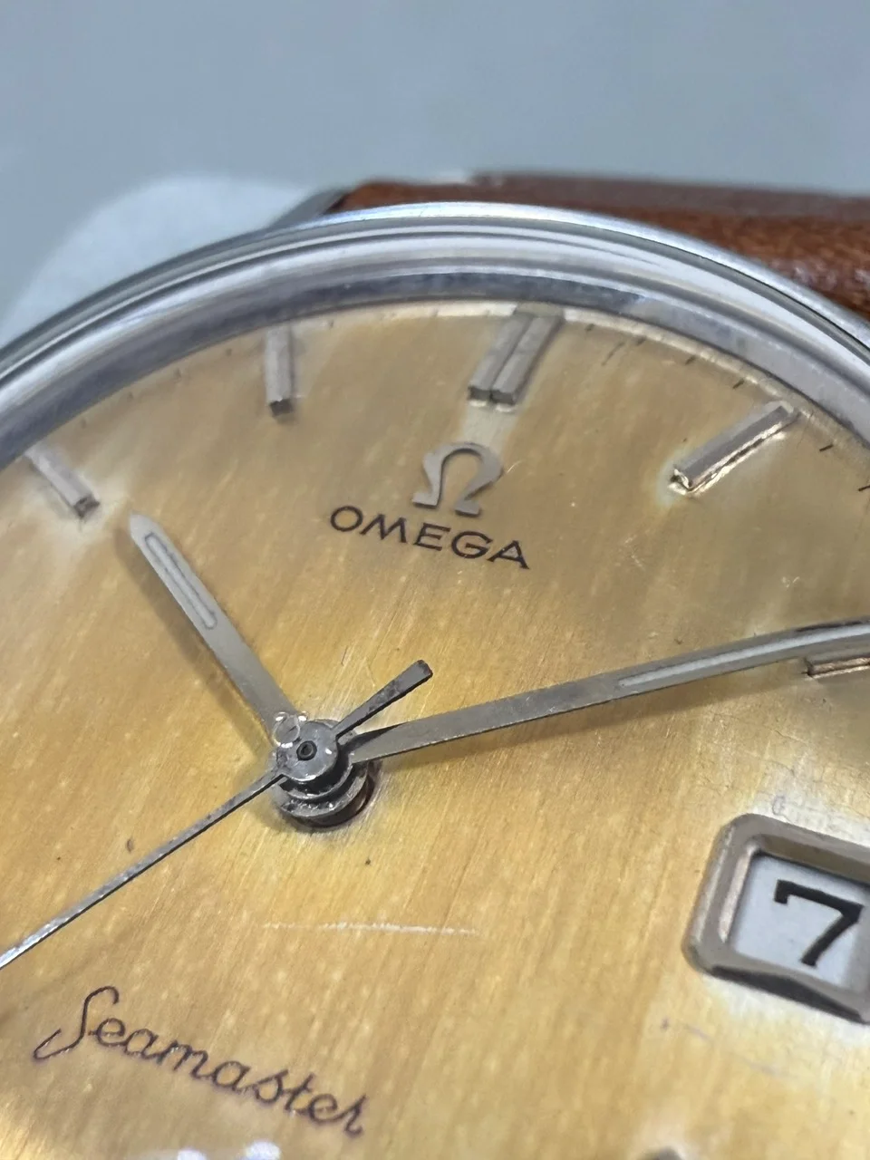 - Dial: Original evenly distributed brown patinated dial; date windown at 3; original hands and hour markers; lume on hour markers has been lost; hanger "Seamaster".
