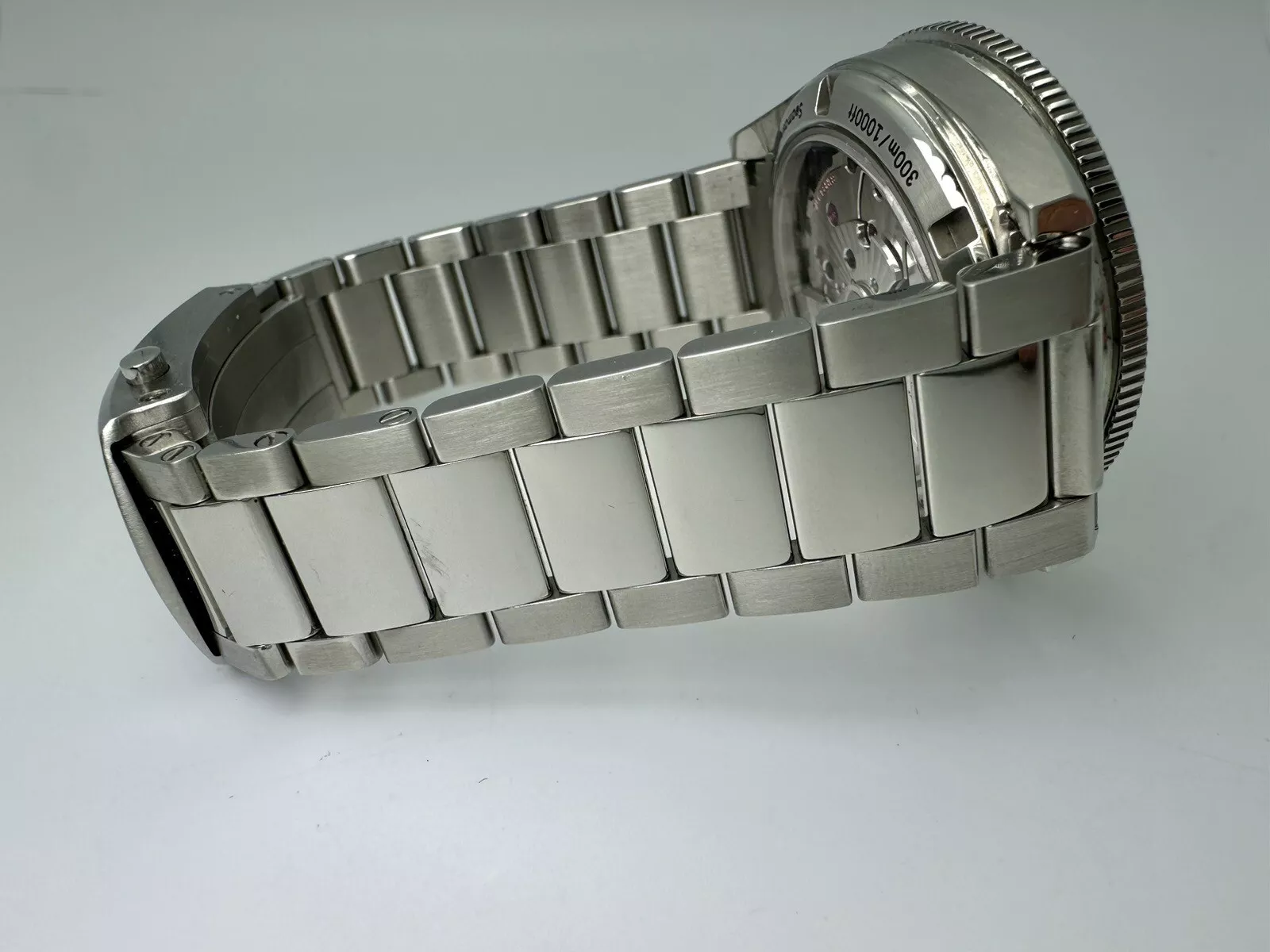 It features a 41 mm brushed and polished stainless steel case on matching bracelet. Additional features include a domed, scratch‑resistant sapphire crystal with anti‑reflective treatment and a transparent case back. It has a sand-blasted black dial with rhodium-plated hands coated with "vintage" Super-LumiNova. The polished ceramic bezel ring has a Liquidmetal™ diving scale.