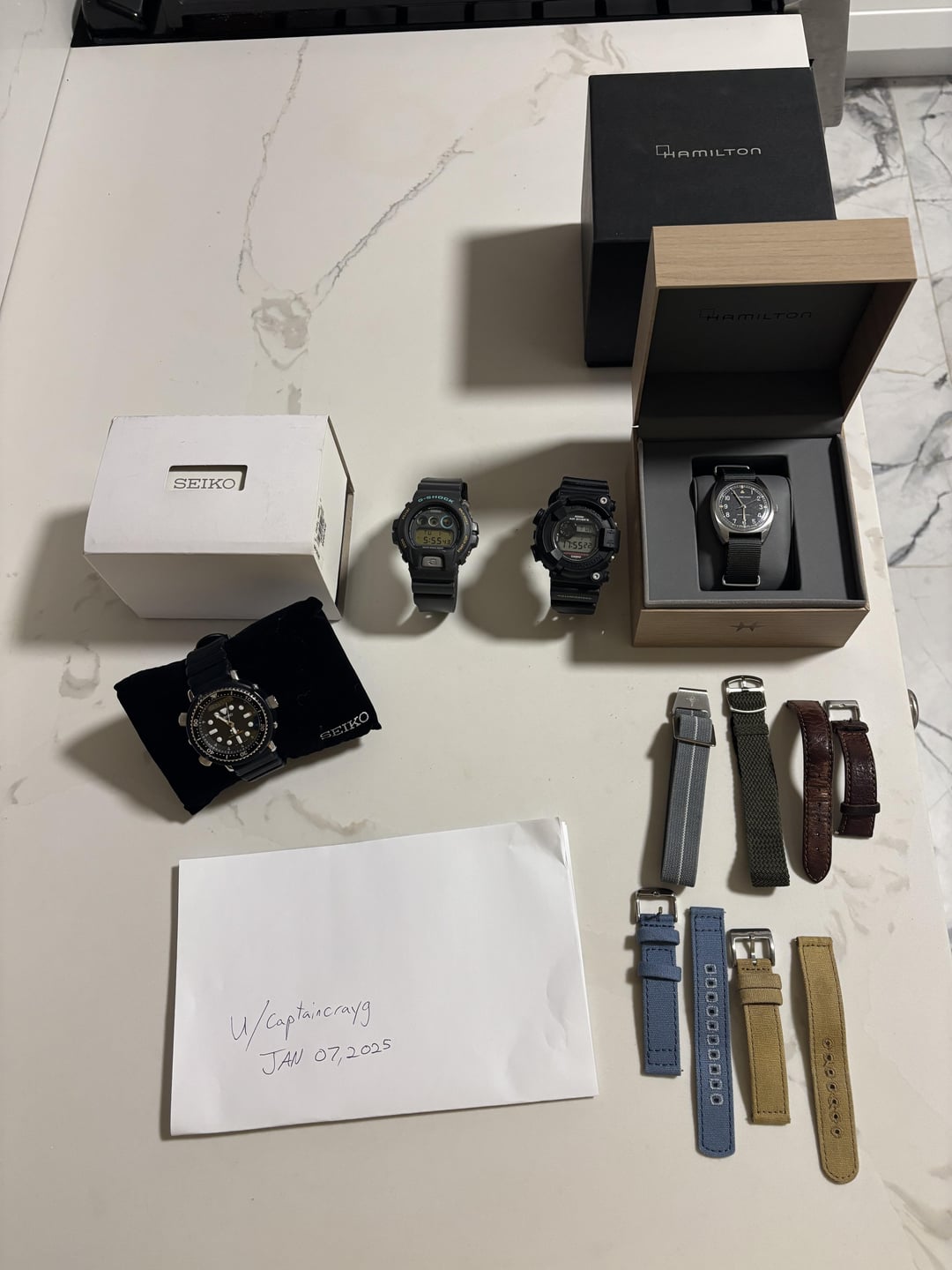 New year, trying to thin out my collection. Would accept a trade for a Citizen Aqualand JP-2000. Hamilton Khaki Pilot Pioneer Mechanical - I used it as a tool watch and there are some scuffs on the case (see photos). The crystal also has some very light scratching that I wasn’t able to capture but should be easy to buff out with Polywatch. Comes with the Hamilton strap as well as extra straps including two quick release from Barton Straps (Tan, Blue), a perlon strap in green, a Cheapest NATO Strap (gray) and a leather quick release strap (I forgot what brand it has a “P” logo on it) - $425 OBO Seiko Prospex SNJ025 Arnie - some scratching on the strap holder. asking $350 OBO Casio G-Shock Ref. 6900 by John Mayer x Hodinkee $350 OBO, some dents on the band and no original box Casio G-Shock Ref. DW-8200Z-1T All Black - All original except the strap holder which is aftermarket. Asking $325 OBO All prices include USPS Priority Mail shipping CONUS. Imgur link with more photos: https://imgur.com/a/2gEnAvv