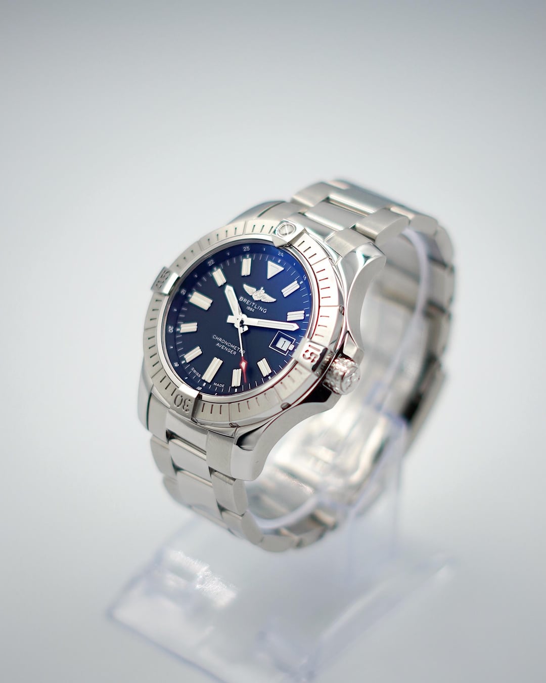 Hey WatchEx enthusiasts, we are having a great deal today. Up for sale is the well known Breitling Avenger. The watch is in very good pre-owned condition. Crystal is like new. The dial is black but that crazy looking anti reflex makes it pop like a blue. Signs of wear on the case and bracelet. Never been polished! Please see the pictures for better reference. Model: Breitling Avenger, Black Dial Reference: A17318 Movement: Automatic Power reserve: ~38 hours Case material: Stainless steel Case diameter: 43mm Water resistant: 300m Box/Papers: Original Box, Travel pouch and eBay authenticity guarantee card Timestamp: https://imgur.com/a/N0Clfie Price: $2100 Payments: Wire, PayPal, Wise Worldwide shipping is included in the price! We are feeling comfortable doing a video call or sending you some extra photos and videos. We would be happy to answer all your questions!