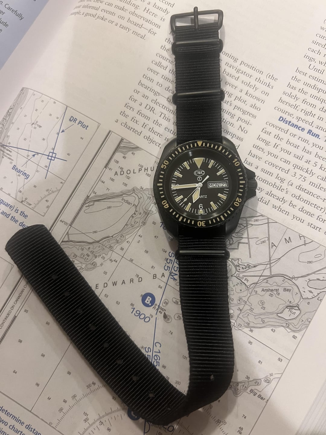 Asking **$750** (shipped) for a CWC 1987 Reissue Quartz Diver w/ full box and papers, which include a 3 year warranty from the original date of purchase (10/22/2022). This is the 1987 reissue, so it has a bit a different from the standard SBS model - specifically the 60 click bezel with an insert similar to the old acrylic bezels and SuperLuminova vintage markings. I am the original owner of this watch (purchased directly from CWC), and I wore it on several adventures during the first few years of ownership given the nice size and rugged quartz movement. This watch has been up remote peaks, rainforests, and waterways of the Pacific Northwest. But lately, I find myself mostly wearing G-Shocks for the functions and convenience. Hence, I've been selling off some watches I've accumulated over the years. The is a very hard-wearing watch and still in good condition, but you can see from the pictures that there are a few small dings on the bezel and case. I'm hoping to pass it on to another owner who will continue to wear it as it was intended and take it on many adventures! **General Specs and Condition** *Movement*: Swiss Ronda quartz w/ day and date complication. All functions work flawlessly and the movement is accurate and running within spec. *Case:* 41mm excluding crown and factory PVD coated. The coating is full and even across the case. There are a few small specks where the PVC has worn off. *Bezel:* The metal bezel ring has a few scrapes (see pictures) and insert has some hairline scratches. Also, the 60-click bezel has a bit of play (doesn't affect functionality), but I recall it's been this way even when purchased new. After watching a few videos online, any watchmaker should be able to tighten this up by just adjusting the bend of the metal click spring inside the assembly. *Dial:* Very bright SuperLuminova. Incides, hands, and bezel all glow. Looking for payment via PP F&F or wire. I am also happy to jump on a video chat and show you the watch and answer any questions you might have. Thanks for looking!