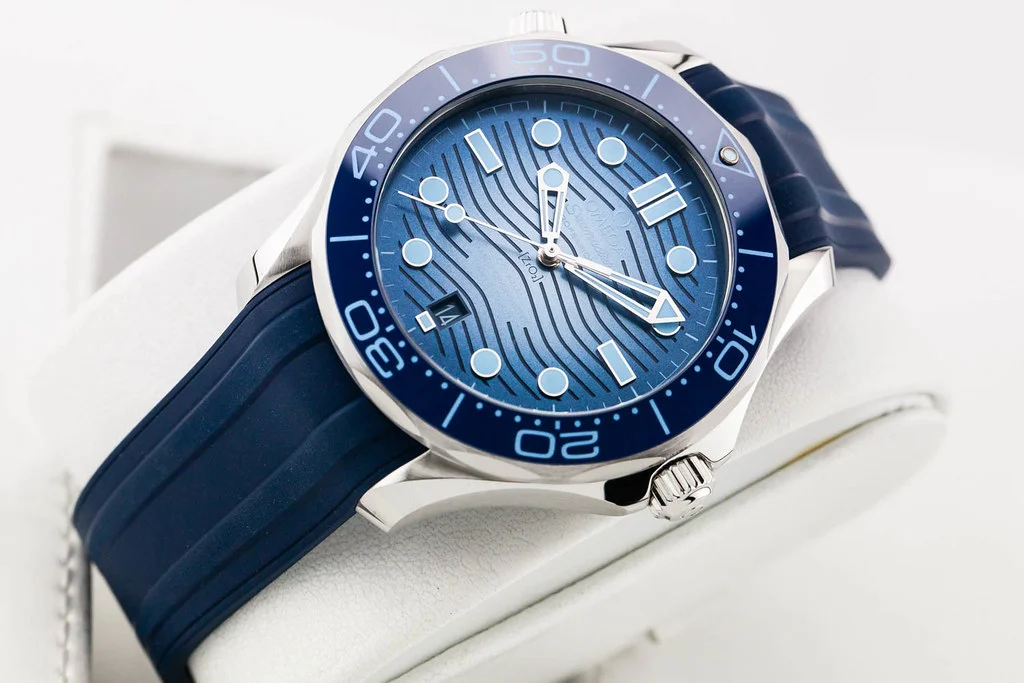 Up for sale is a brand new Omega Seamaster 300M 42mm Summer Blue Dial on Diver Strap, reference # 210.32.42.20.03.002. It comes complete with all boxes, papers, booklets, hang tag and Omega Warranty Card dated June 2024.