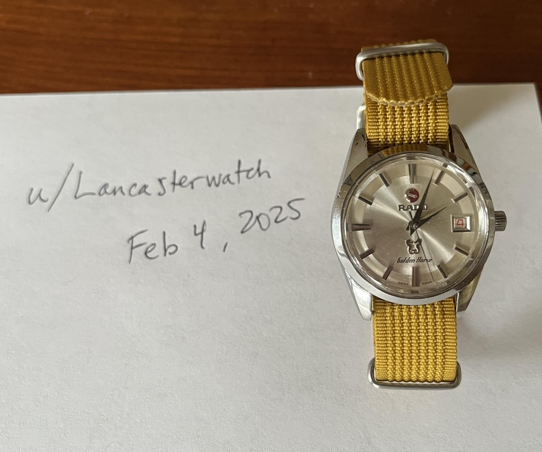 Rado Golden Horse automatic up for sale. This model is from the 1970s and is a great shape. It runs well and was +7 seconds per day when tested in the watchbox. The Rado 2797 306 movement includes hand-winding and hacking, beats with 21,600 vph, and is based on the ETA 2273. The watch comes with a new black leather strap and a yellow NATO strap as shown in the photos. 35 mm wide with 18 mm lug width. The crown is signed with an anchor, the anchor symbol above Rado on the dial moves as it should, and the crystal has an anchor etched right in the middle. Small scratches on the case and there is a ding in the bezel near 10 o’clock. Asking $235 USD shipped tracked and insured to CONUS.Canadian and other shipping available at an additional cost.Payment Venmo, Zelle, PayPal