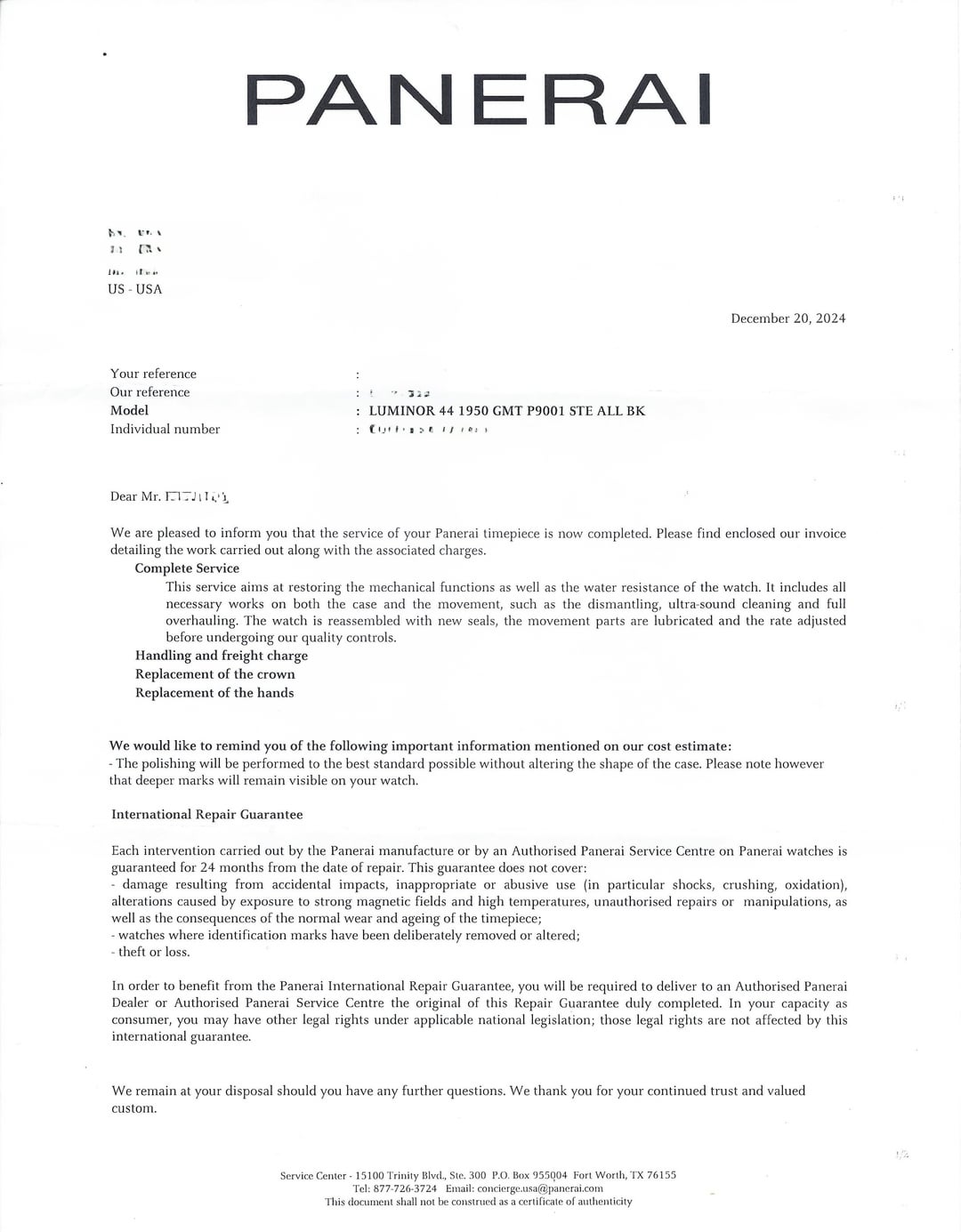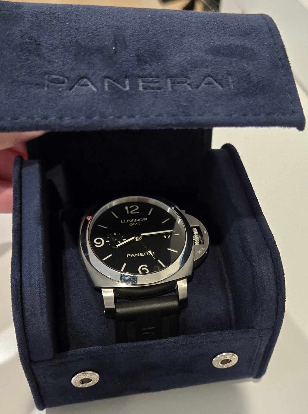 PAM320 Luminor GMT PAM00320 Recently serviced with a 2 year service warranty dated 12/20/2024 The watch comes with the service box as well as 2 aftermarket bands, panerai styles for switching bands and the rubber bezel protector. It is in good preowned condition. Clean sapphire crystal, and the hands and crown were recently replaced by Panerai. This was a very fun watch but I am ready to make room for the next one. I am based in NY Hudson Valley and happy to set up a whatsapp video call. Price is $3,200 shipped to CONUS Timestamp: [https://imgur.com/a/9XHEIkp](https://imgur.com/a/9XHEIkp) Photo Album: [https://www.dropbox.com/scl/fo/3q5jela4p86xmt94hyg5i/AGRIuG\_llK2SalUXi1\_9eZ8?rlkey=ij6ys7bza0q9jo992socqskh2&dl=0](https://www.dropbox.com/scl/fo/3q5jela4p86xmt94hyg5i/AGRIuG_llK2SalUXi1_9eZ8?rlkey=ij6ys7bza0q9jo992socqskh2&dl=0)