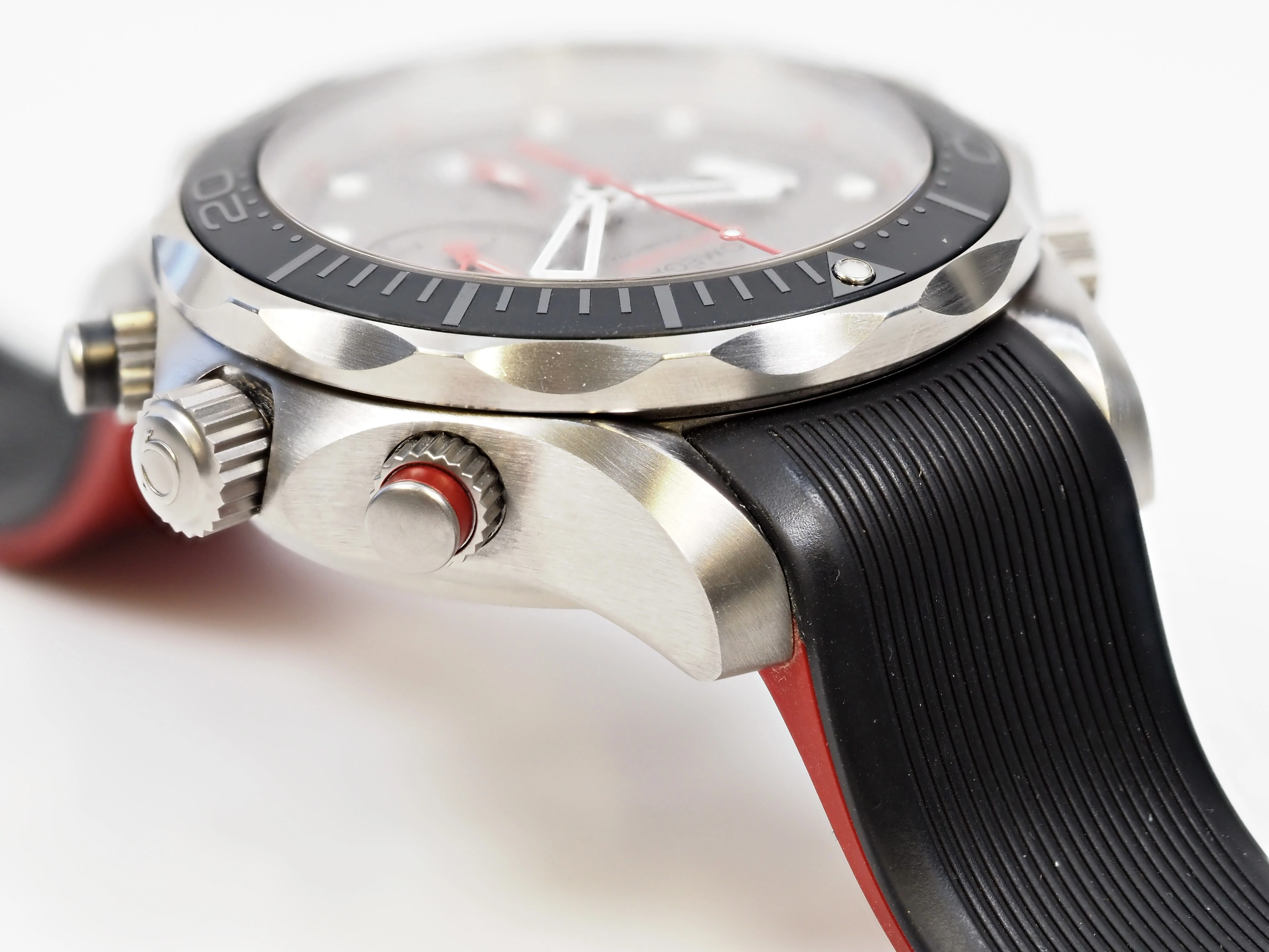 Bracelet: Black/red rubber strap with titanium deployant clasp