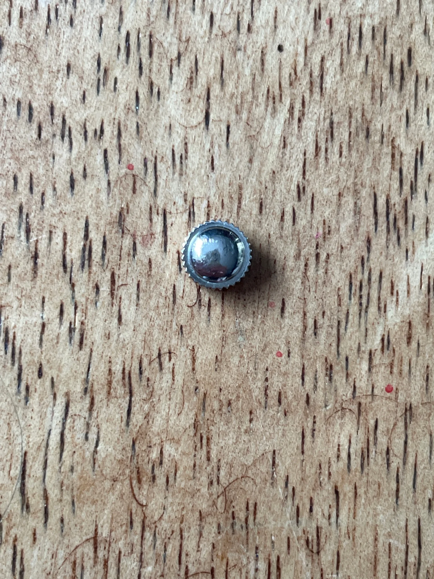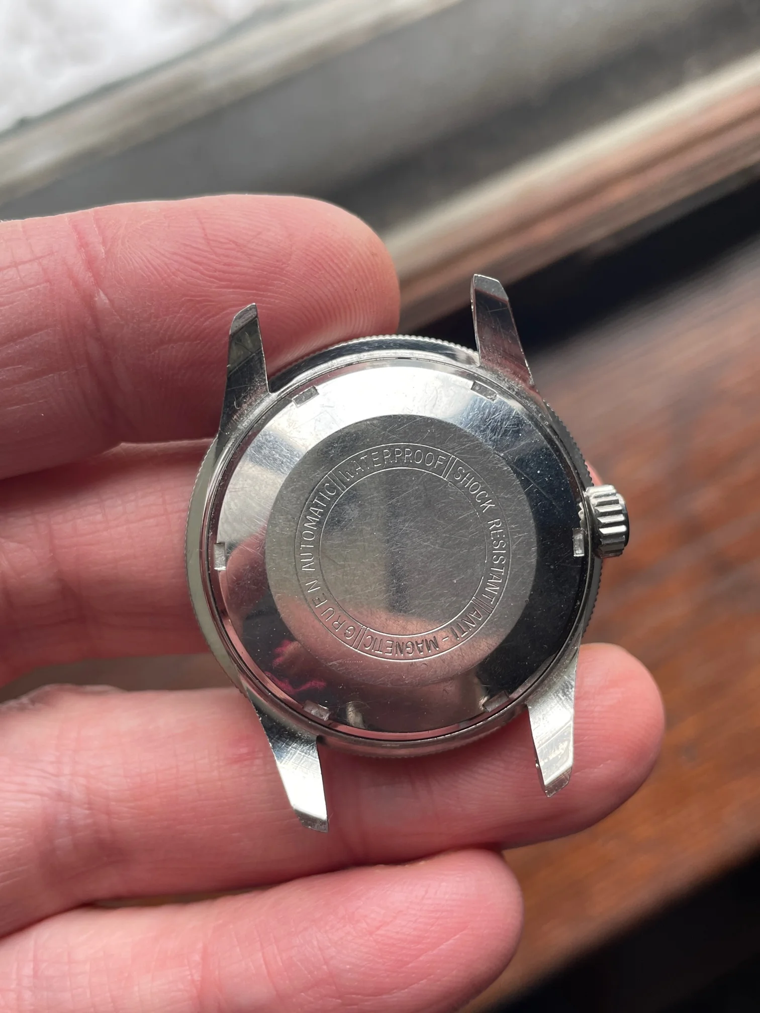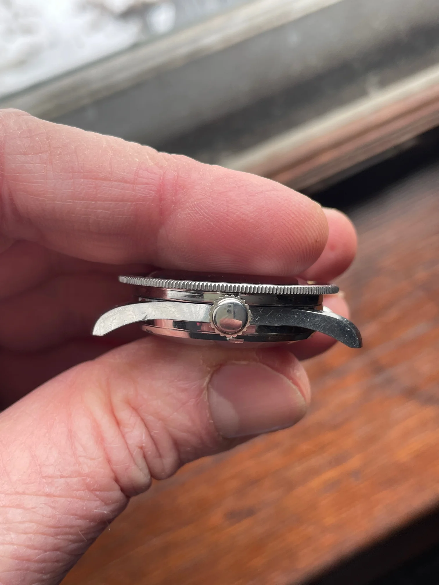 CASE: 39mm steel case still has sharp lines and doesn't appear to have been polished. The crown rotates bidirectionally, and has a few scuffs, but (imo) still looks presentable. The crystal and crown were replaced during service, the former because of a crack, the latter because the inner gasket was stripped and couldn't be replaced (it doesn't have o-ring gaskets, but instead a sheath). Both crystal and crown will be included with the watch.