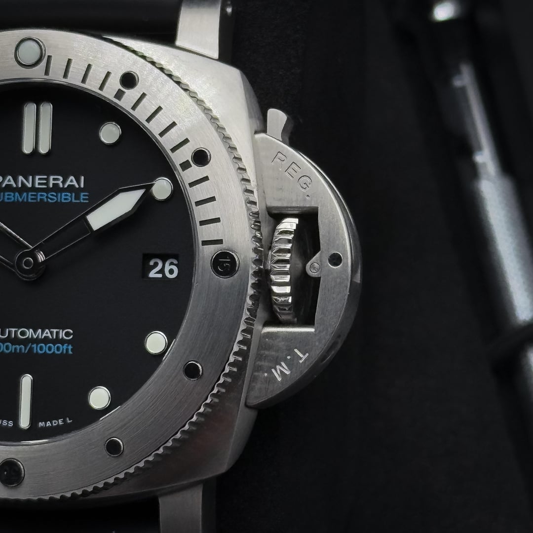 NOS (New Old Stock) 2022 Panerai Luminor Submersible 42mm PAM00973 Stainless Steel Automatic Dive Watch Full Set with Original Box/Papers, Extra OEM Strap, and Strap Tools Here is one of Panerai’s most popular dive models to date, coming in the perfect 42mm case size. This watch features Panerai’s In-house calibre P.900 3-day automatic self winding movement. Featuring hours, minutes, seconds, and date functionality. minutechronographs to date. This reference was limited to 1500 units and is now discontinued! MSRP: $9,300 PRICE: $5️⃣,7️⃣5️⃣0️⃣ + Label Numbered Unit: #1270/1500 This watch has an original manufacture date of 8/19/2022 but was sold as “New Old Stock” in 2024. The warranty card is dated 11/6/24 leaving 7 years of factory warranty! Please note this watch is covered under Panerai’s factory warranty until 2032! Condition: Excellent condition showing little to no signs of wear throughout. The watch was sold brand new 4 months ago, and worn less than 5 times. Looks and wears brand new! This Set Includes: All three boxes including the collectable submersible tool box, extra OEM velcro strap (Unworn), both strap changing tools, dated warranty card, serialized tags, International warranty booklet, bezel protector, and manual All of my watches are carefully Inspected, Authenticated, and Photographed before listing. Please see photos for the best representation of the watch, its condition, and what it comes with! Please feel free to reach out with any additional questions if necessary. Brand: Panerai Model: Luminor Submersible 42mm Reference Number: PAM00973 Movement: Mechanical (Automatic) Case Size: 42mm Case Material: Stainless Steel Bezel Material: Stainless Steel Year of Production: 2022 Dial: Black Water Resistance: 300m (30 ATM) Crystal: Scratch-Resistant Sapphire Crystal With Original Box: Yes With Original Papers: Yes Band Material: Black Rubber / Black Velcro Buckle: Tang Buckle Crown: Fixed Crown Functions: Hours, Minutes, Seconds, Date Gender: Men’s Watch/Unisex