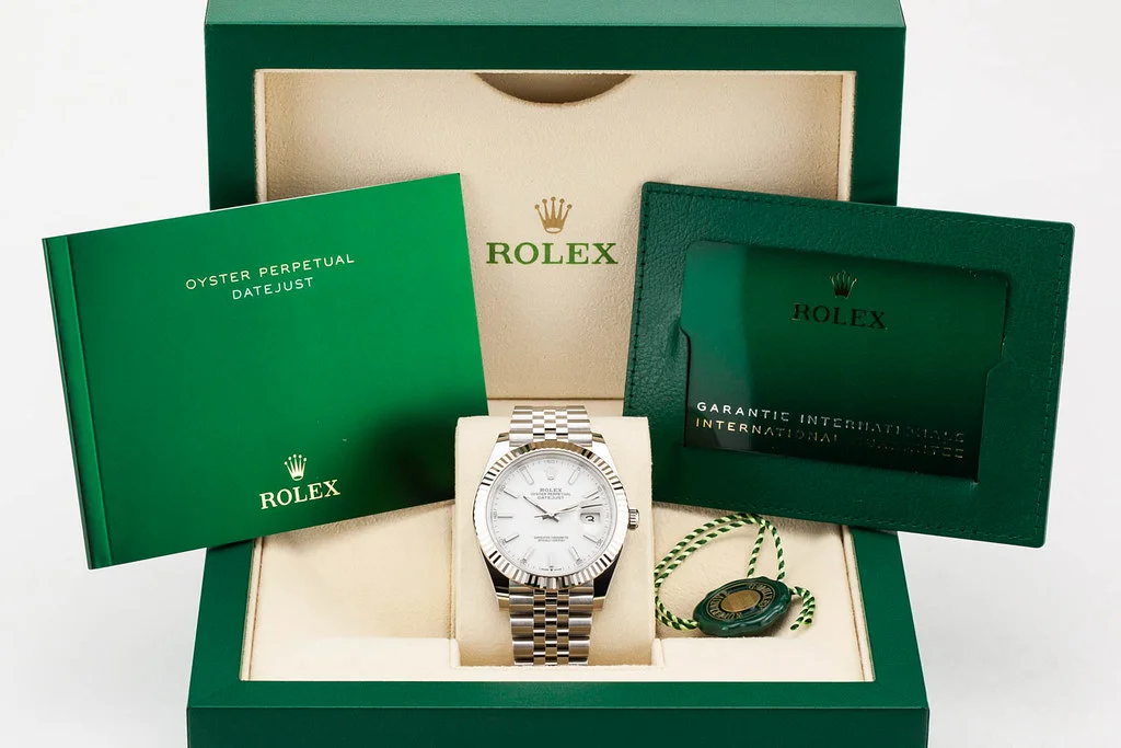 Up for sale is a brand new Rolex Datejust 41 White Stick Dial with Fluted Bezel on Jubilee Bracelet, reference # 126334. It comes with all boxes, papers, booklets, hang tag and Rolex Warranty Card dated February 2025.
