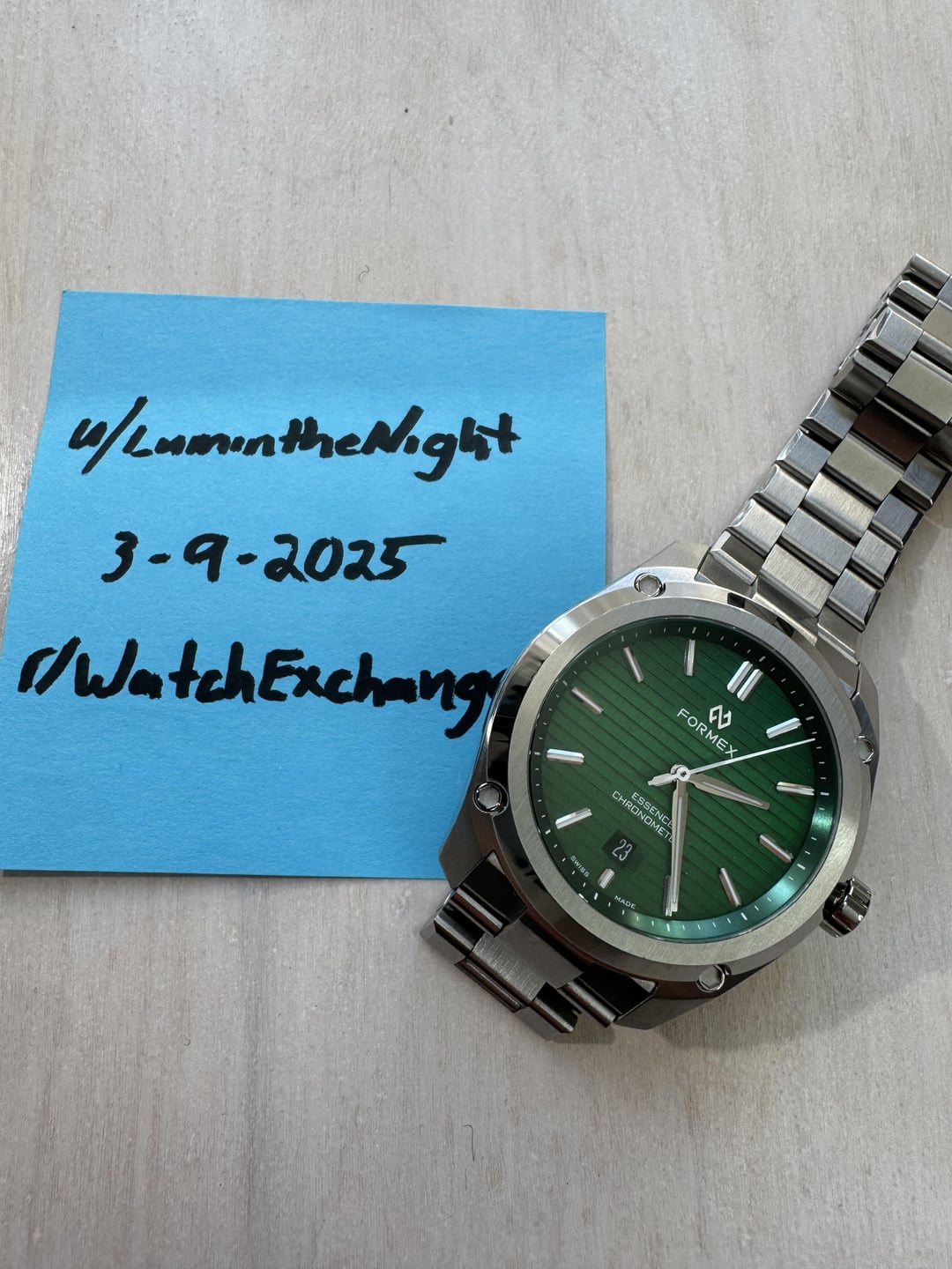 Hello WatchExchange and watch fam! I am going to be selling off a fair number of my watches in the next couple months. I have had some unexpected expenses, and am needing to pay down some bills. Sad to see them go. I keep my sub updated with the watches that I am currently selling and are available. r/LumintheNight Selling my 43mm Formex Essence, green dial. Watch is in excellent condition, showing only the slightest hints of wear. The color matched date wheel always makes me happy. Running within chronometer specs. Full set, including all boxes and papers. Runs good. Smooth date and time setting. Please look over the photos. Including photos of it running in 5 positions on the timegrapher. Asking $890 (if you are not a bracelet person, I would be interested in selling the watch with a black leather strap but no buckle, at a reduced price.) Shipping in the states included, I try to ship UPS 3 Day. International shipping possible, let’s chat details. Please drop a comment here before sending me a message. (That way I can easier see your transaction history) I am not a business, I am just a guy who has bought way too many watches the last couple years. No trades at this time, as I am in need of cash to pay some bills. I have 185+ confirmed transactions here on WatchExchange. I have over 15 years and over 1,250 100% positive feedbacks on eBay. If a purchase doesn’t meet your expectations, let’s talk it over. But I won’t accept a return if you change your mind on the watch. Payment by Zelle, Wise or Venmo GS is prioritized. GS +3% (price is net amount to me) If you are a well established member of Watch Exchange, we can do PayPal or Venmo F&F. Feel free to ask me any questions. I am happy to chat watches.