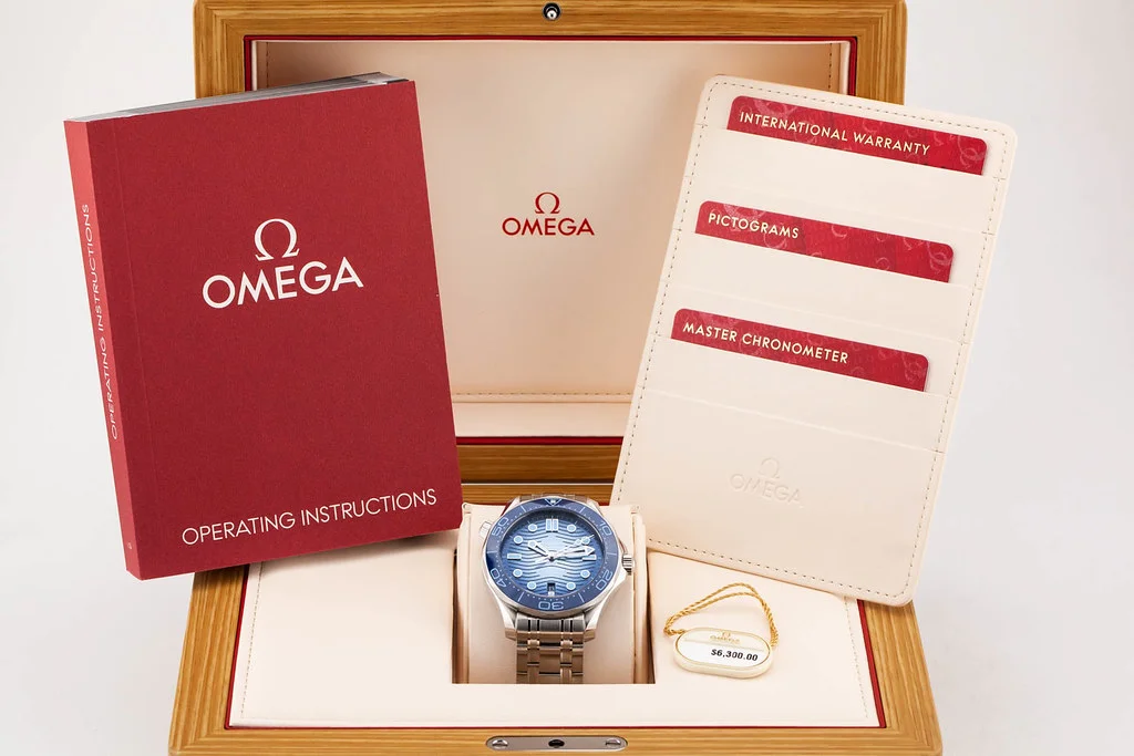 Up for sale is a brand new Omega Seamaster 300M 42mm Summer Blue Dial on Bracelet, reference # 210.30.42.20.03.003. It comes complete with all boxes, papers, booklets, hang tag and Omega Warranty Card dated June 2024.