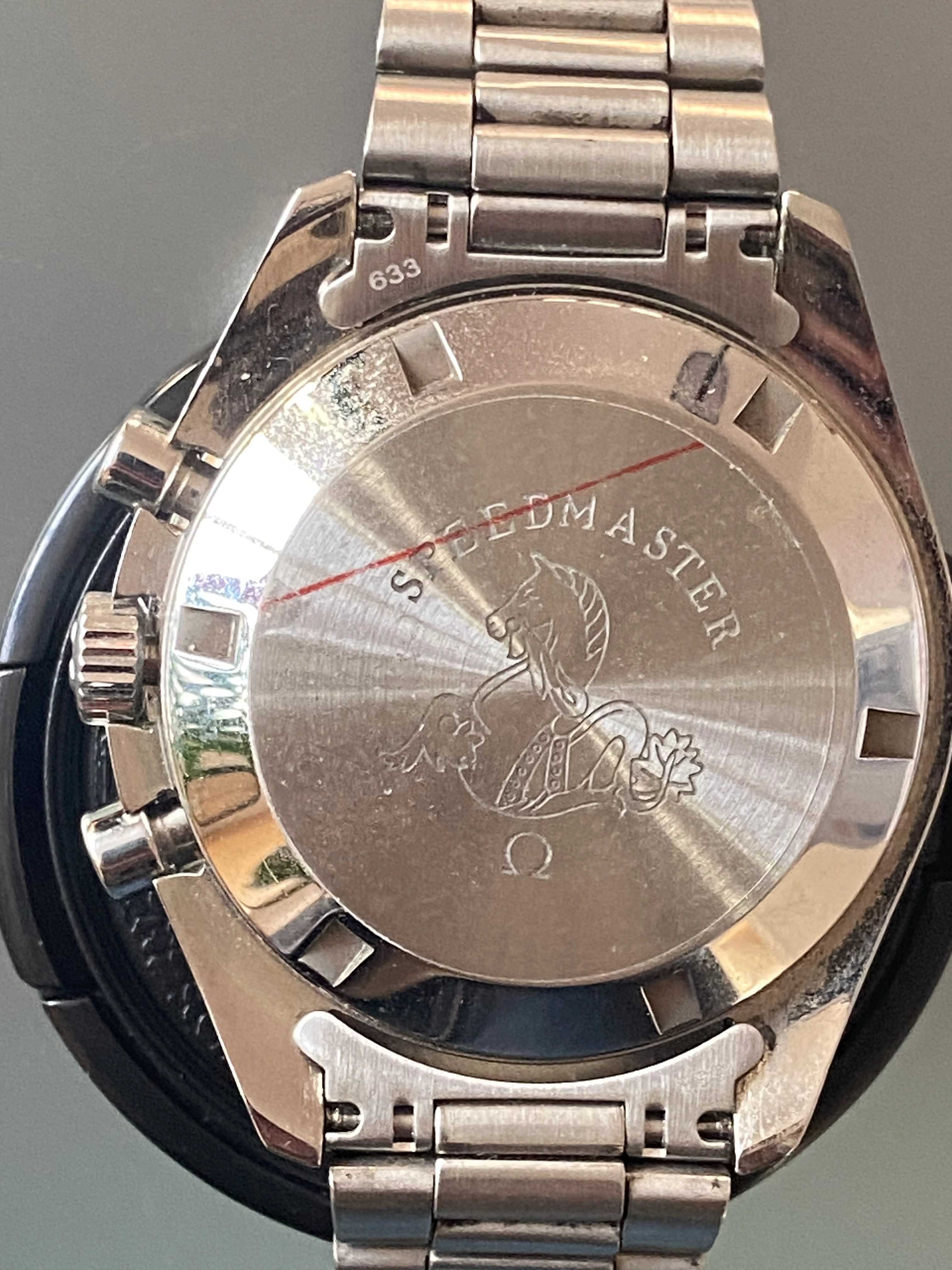 Midcase has seen a polish, tops of the lugs look good and sharp and it looks great on the wrist. Polish seen most notably on one lug but it still has good definition. Caseback is a service caseback in the pre-moon style to make it look “correct” to the real Pro grey racing.