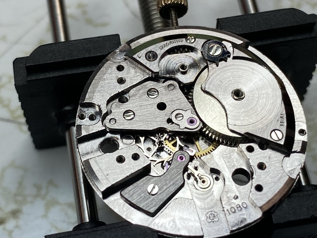 Hello Folks, Up for sale is a vintage Hamilton I fully serviced. New crystal, new mainspring, new gasket and now it runs beautifully! About 3 seconds off a day and 220 amplitude and .5 beat error at its worst. Very pleased with that. A great affordable entry if someone likes vintage watches but has a limited budget. The movement is a 671 (which is the ETA 1080 you'll see stamped in the pictures) and due to it's age, please treat more gently than you would a modern watch. This one does have shock protection for the balance staff, but the usual applies: Avoid water, avoid magnets, and this is not a field watch for rough housing. The dial has some wicked cool radium burns, original hands and after long weeks of testing, the watch runs and doesn't stop or suddenly gain or lose time. That said, this was serviced by a hobbyist, not a professional. The case is pretty beat up. The lugs can still hold a strap, but I recommend a quick release strap (the king with pins you can push down, no tool required) and if you take it to a watchmaker, tell them to unscrew the case back gently and carefully so they don't destroy what's left of the threads. Brute force and clumsy hands will not be this watch's friends. Heavy wear on the lugs and back, but the front of the bezel and case are in really good shape. It just looks cool. Given its condition, I'm only asking $150 net to me so I can cover my costs and a little extra to pay the taxman. Buy pays shipping and it will be tracked. I don't mind shipping outside of the US, but depending on where to, for the right buyer. Thanks for looking, Sparky