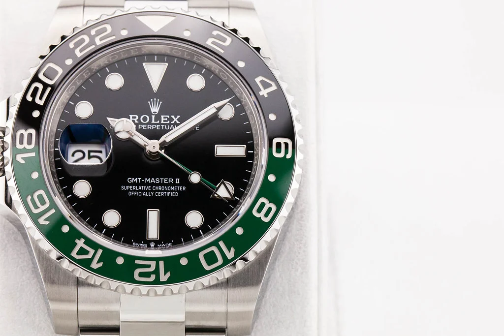 Up for sale is a brand new Rolex GMT Master II Sprite Lefty 40mm Black & Green Ceramic Bezel on Oyster Bracelet, reference # 126720VTNR. It comes complete with all boxes, papers, booklets, hang tags, and Rolex Warranty Card dated September 2024.