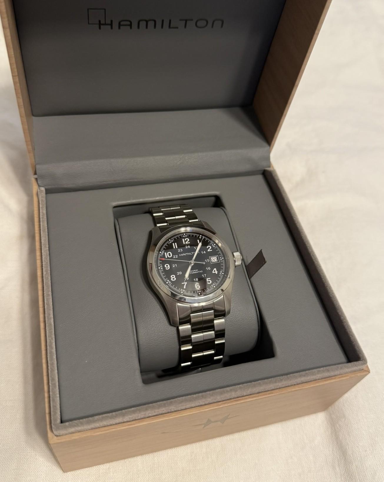 For sale a Hamilton Khaki Field Auto 38mm on bracelet. Bought late 2024 and in excellent condition overall - case shows some minor wear around the polished bezel and watch was worn on a leather strap so bracelet is in near mint condition. Crystal is in perfect condition. Comes with original box and hang tag. Seeking $499 shipped CONUS. Prefer PayPal or Venmo. Happy to provide additional information to serious buyers. [Album ](https://imgur.com/a/khaki-album-Q1g51eH)| [Timestamp](https://imgur.com/a/khaki-timestamp-gyg2qkn)
