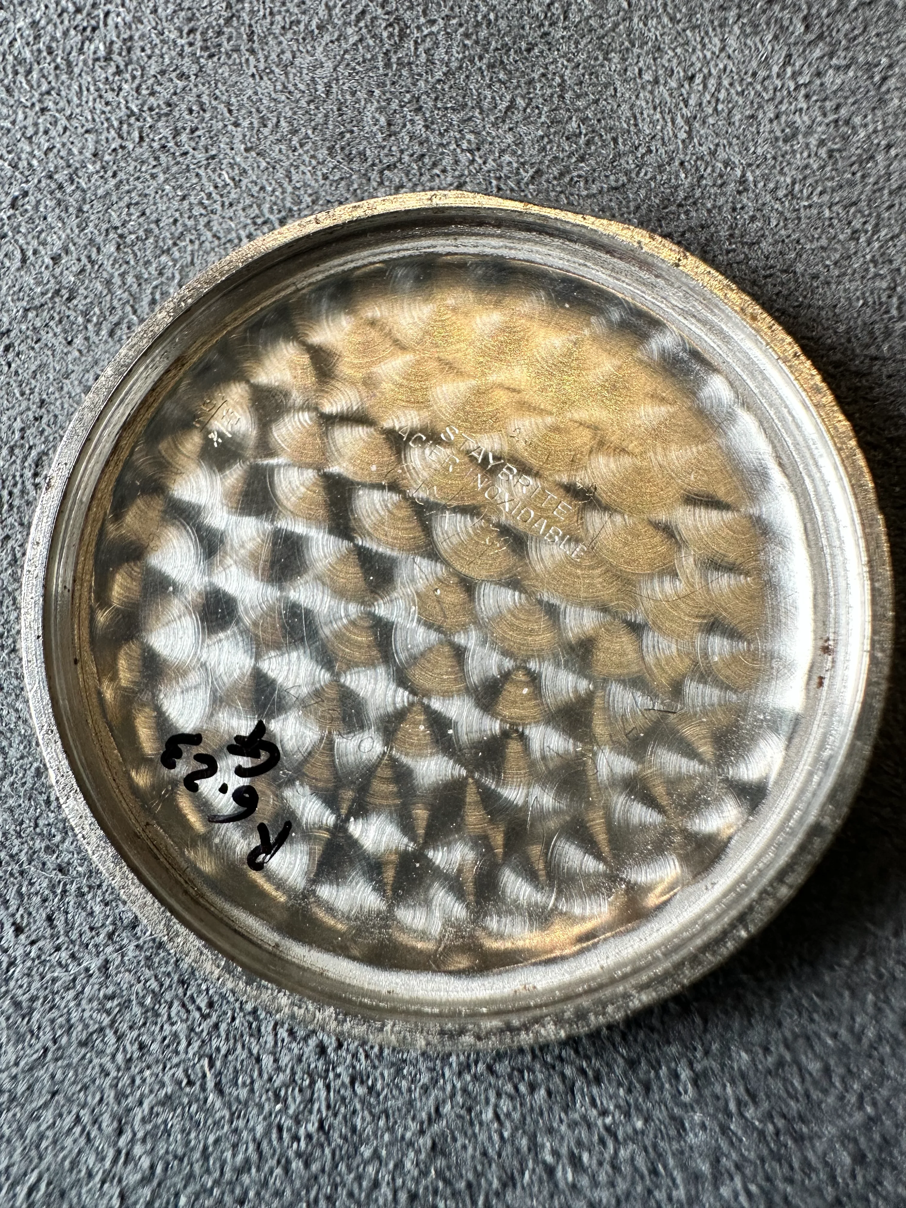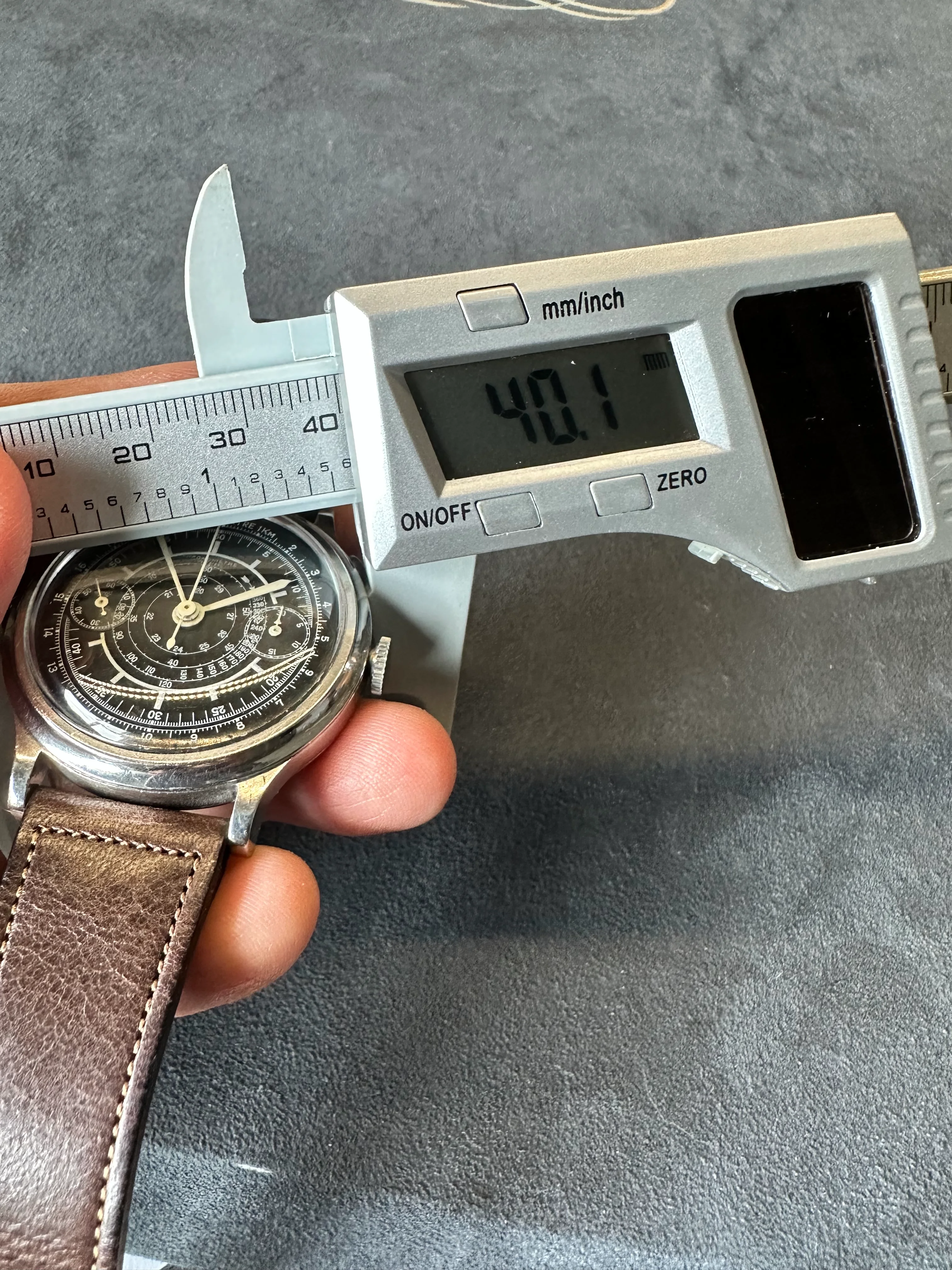 Watch has a beautiful massive huge case at 40mm and is powered by Landeron Hahn 39. All works perfectly fine for the winding has a slight slip at certain perhaps a broken teeth, but nonetheless works perfectly ok. Unknown service history.