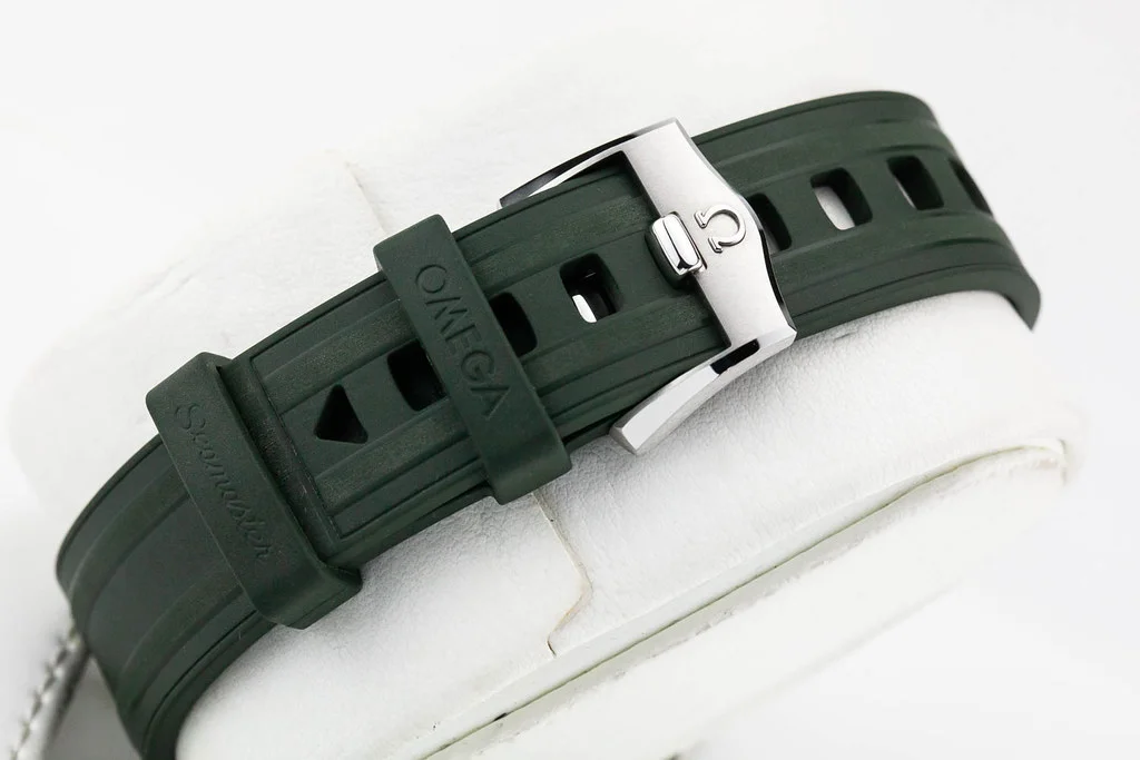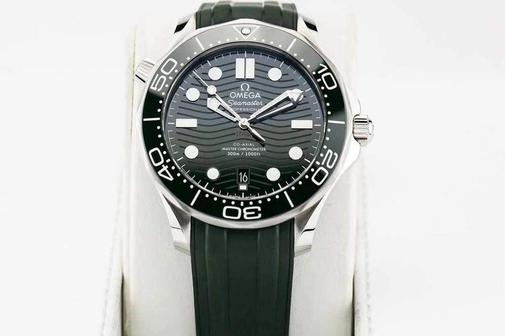Up for sale is a brand new Omega Seamaster 300 Green Wave Dial on Rubber Strap, reference # 210.32.42.20.10.001. It comes complete with all boxes, papers, booklets, hang tag and Omega Warranty Card dated April 2025.