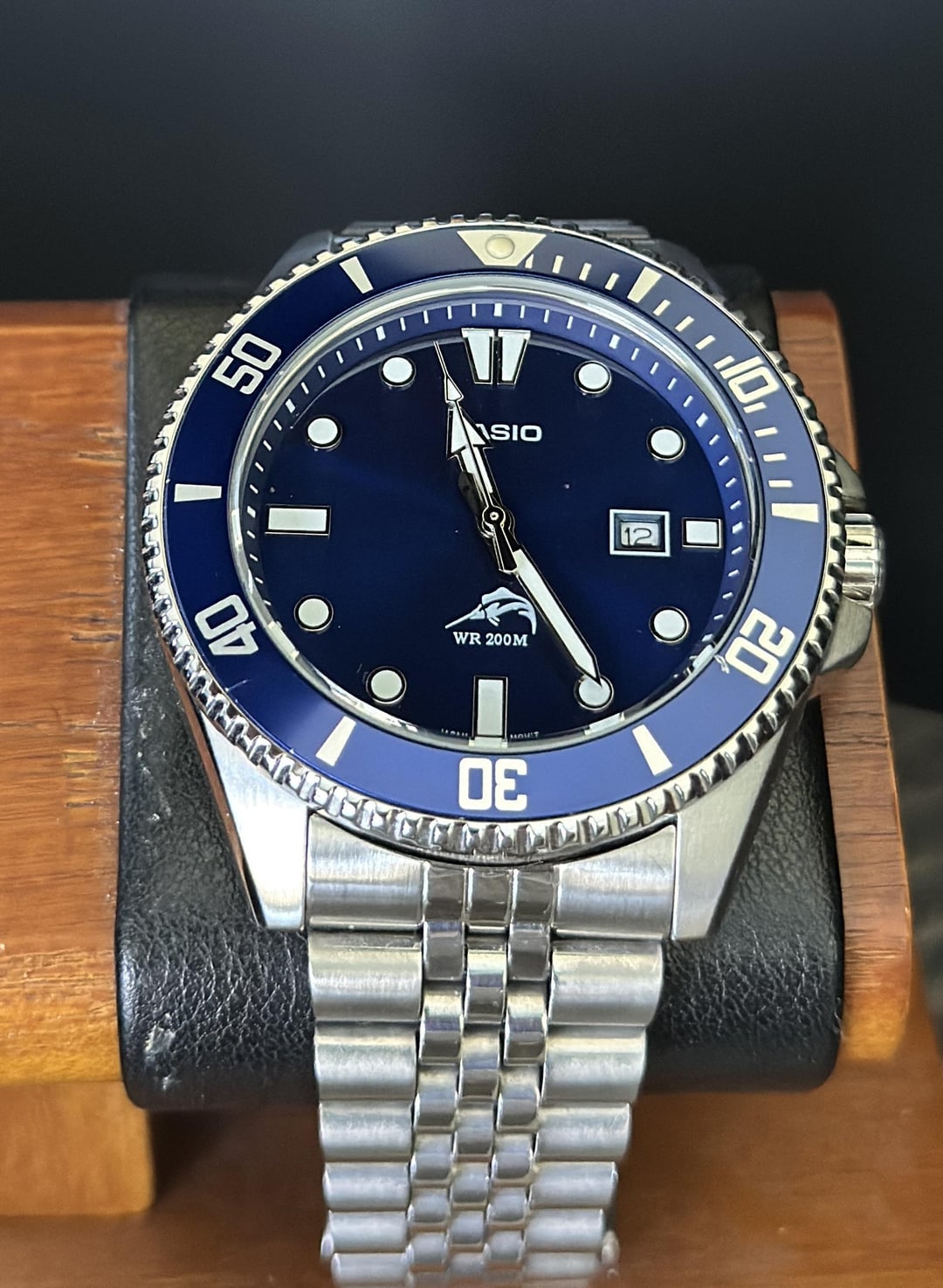 Up and available to ship is this awesome 3 watch starter and display case. First up: Hamilton GMT 200M Diver 42x12x52 Complete kit Great condition Second: Steinhart Ocean 44 44x13x52 Complete kit Great condition Third: Casio Marlin 44x12x49 Watch only on a Seiko jubilee Last: Wolf 10 slot display box Good condition Missing the pull tab for the storage drawer Bonus: Two 22mm Zuludiver sailcloth straps and one very comfortable elastic NATO! Asking $975 shipped within conus, zelle preferred (other options available for sale however with reference or confirmed sales)