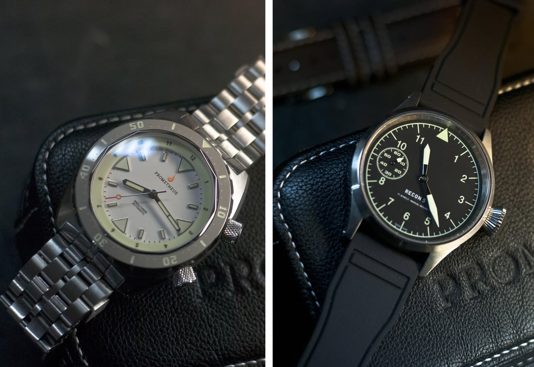 A great deal on 2 great watches from a great brand. Both are in exceptional condition and loaded with ETA movements Downsizing my collection and tired of wheeling a dealing. So here is a no-nonsense deal to get them to a new owner $499 paypal $10 shipped USPS Tracked Prometheus Eagle Ray I purchased this watch from the original owner. I have personal owned it for about 5 months the watch is in stellar condition. just A few minor rubs on clasp and under the lugs. The Lume on the watch is THE BEST in the business. X1 C3 is heavily applied all over the dial. I will not be held responsible for it waking you up in the middle of the night burning your retinas. Prometheus Recon A really cool flieger with a Unitas decorated movement In almost new condition and full kit. Along with unused original strap. Along with a really nice FKM rubber pilot strap Wears pretty compact for its size. Feel free to ask questions or for more pics.