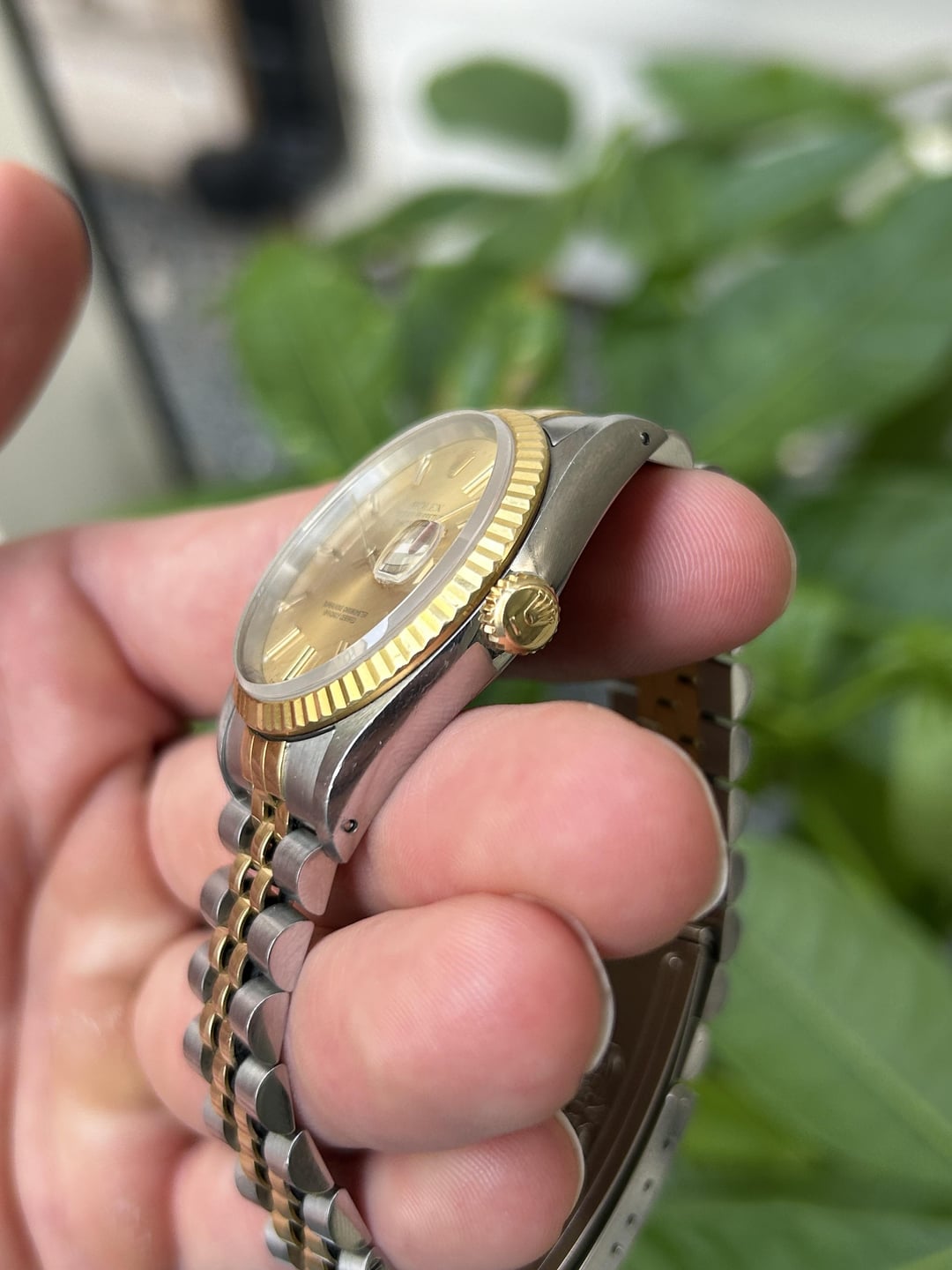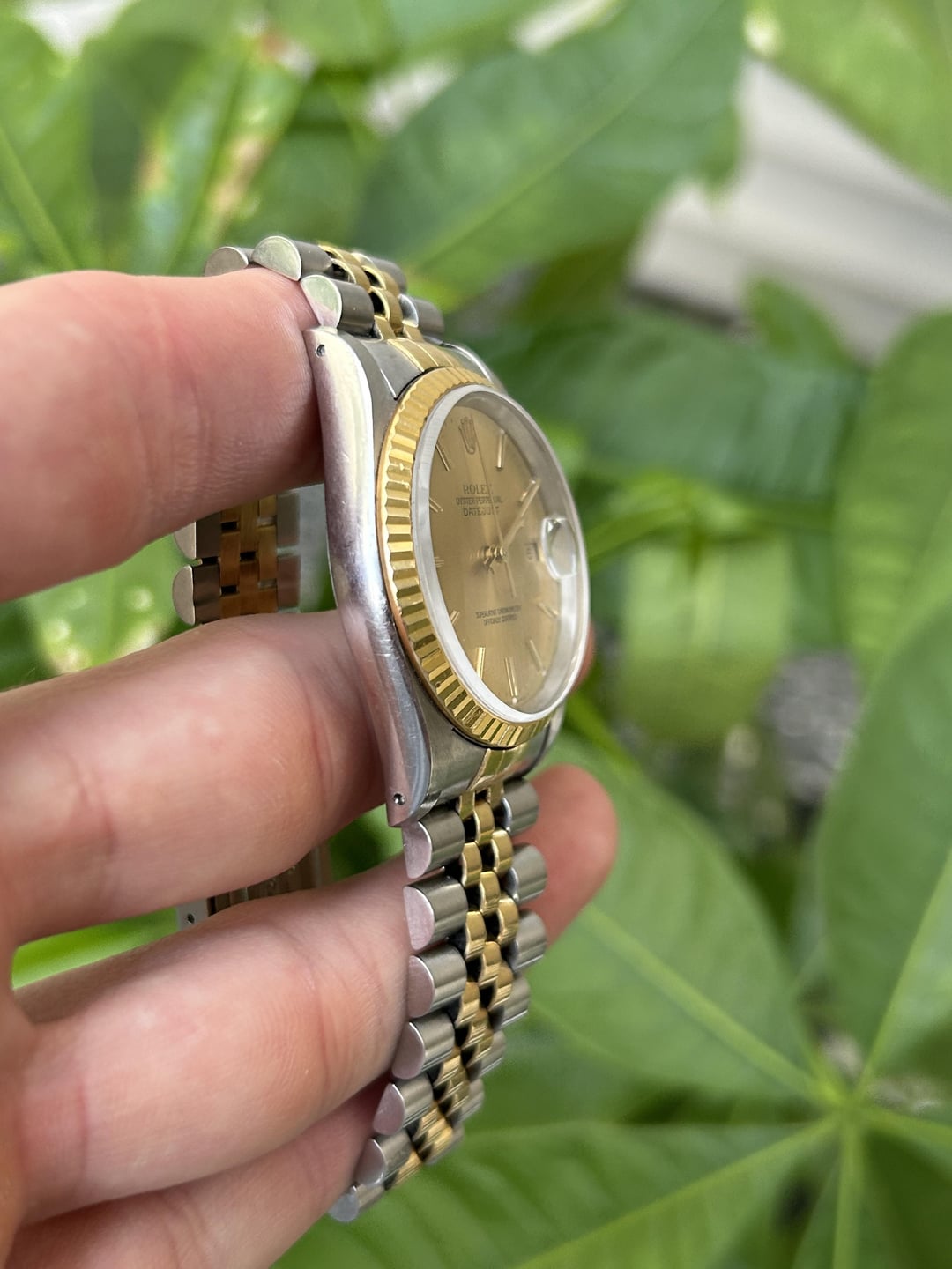 16233 36mm Datejust X serial circa 1992 Watch only (will ship in nice watch roll/travel case pictured) Sharp holes case, clean sapphire crystal, perfect dial and hands. Bracelet has 20 links and is in good condition showing moderate stretch for its age. Watch runs decent (+10sec/day & 250amps) Overall really nice piece. Asking $5,300 delivered via FedEx fully insured label. Located Htx [instagram for more](https://www.instagram.com/watchesinhouston?igsh=NWxkdjFnb2F4azl3&utm_source=qr)
