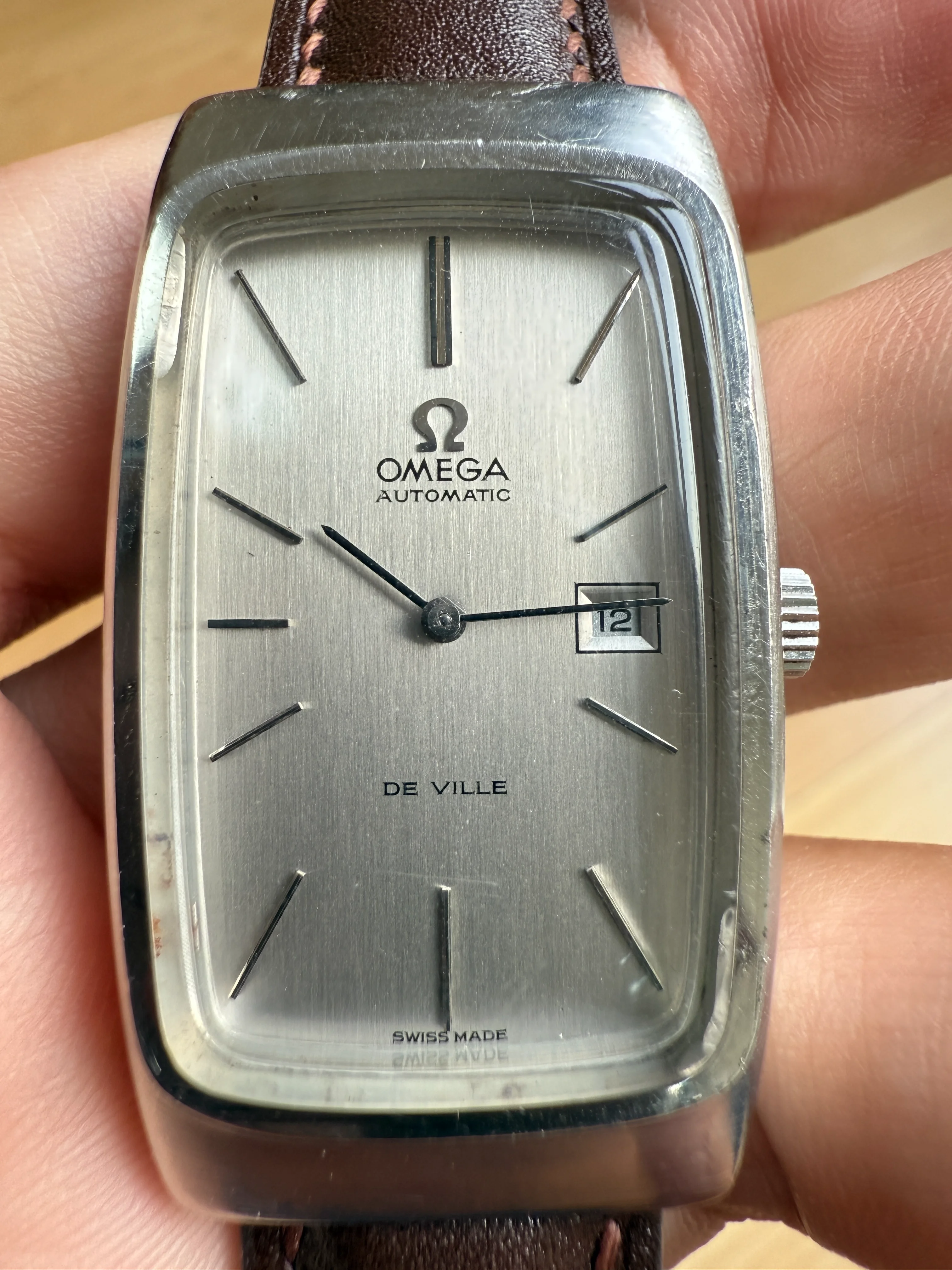 il y a 11 mois | (Price Reduced) Uncommon Tank Omega De Ville 156.0001, size 44x26mm, vertical brushed dial, brand new handmade leather strap, original Omega buckle | €525 | |