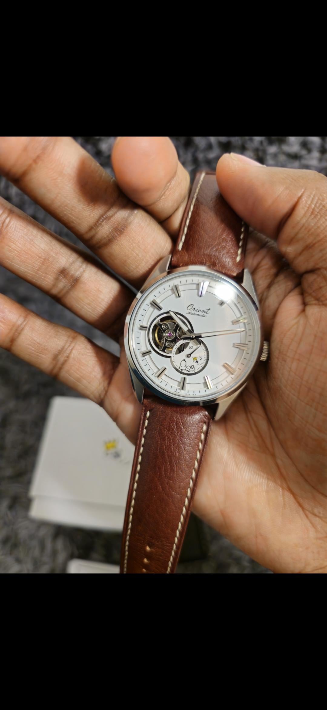 Limited-Edition Orient x Peanuts Watch 40.8mm – $370 + $20 shipping cost(Paypal and remitly) G&S fees are burden of buyer. Minor signs of wear. Looking to clear space and reduce collection size. Featuring Snoopy & Woodstock 🔹 Original Orient logo in cursive, anniversary artwork, and a Semi Skeleton aperture. 🔹 40-hour power reserve 🔹 Limited to 1,900 pieces. Box and papers included.
