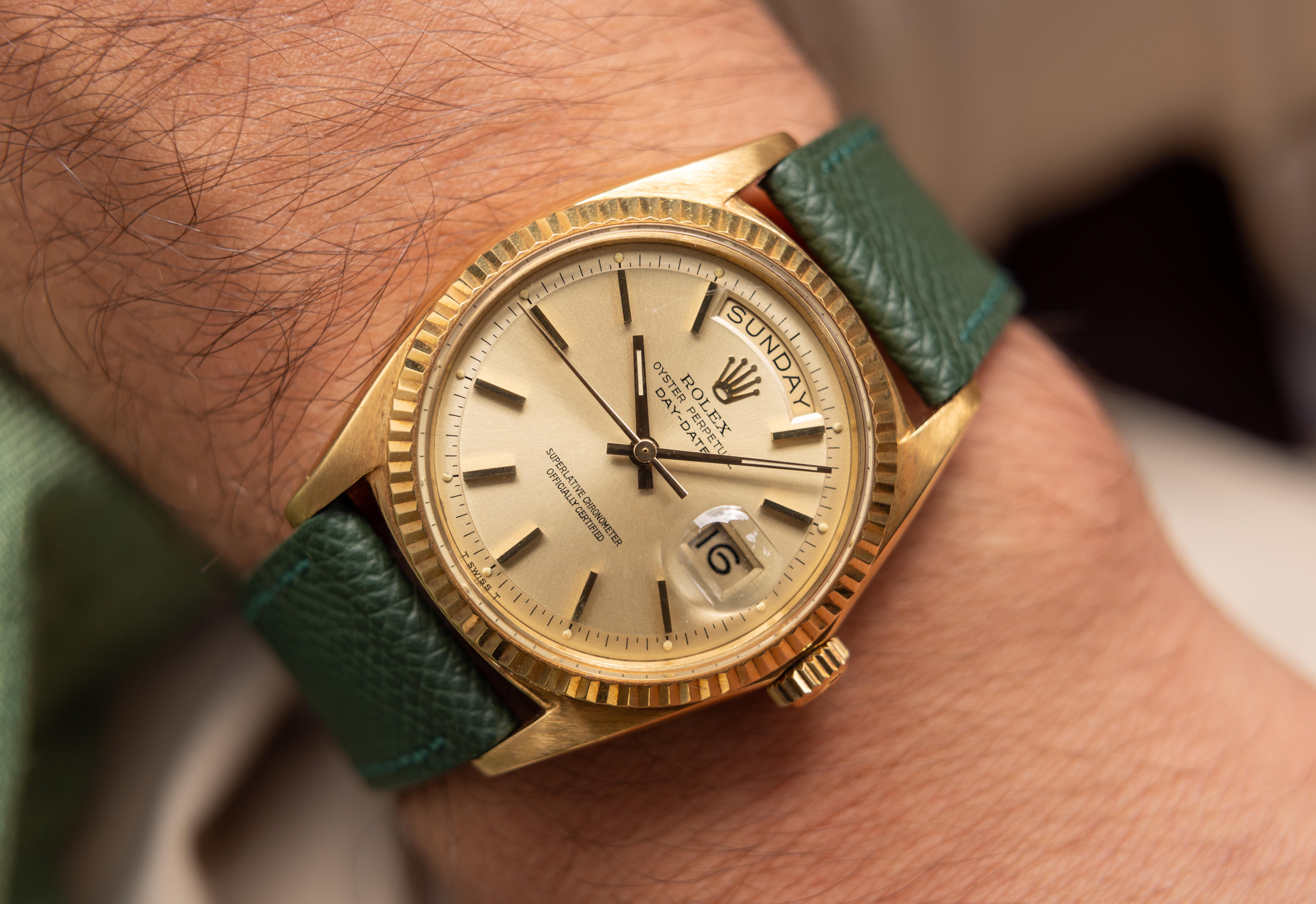 [pics](https://imgur.com/a/gxNs0Ay) [timestamp](https://imgur.com/4OikwQK) Case: The 18k yellow gold 36mm case is in excellent condition with strong lugs and minimal signs of wear. 2,525,XXX serial. Dial: Excellent condition champagne dial. The lume has aged to an attractive cream color. Open 6/9 date disc with English day disc. Bracelet: Fitted on a forest green leather strap with matching gold-tone buckle. Accessories: None. Watch only. Notes: When I first got into this game, an 1803 on a leather strap was my grail; they are elegant, rich, and dressy without being gaudy and drawing attention. Offered at $9,250 shipped. Payment by PayPal F&F, bank wire, or crypto. Located in San Diego, CA. Insured overnight FedEx shipping. International shipping available. Buyers shipping the watch to CA will be required to pay applicable sales tax. Thanks for looking and feel free to message me with any questions!! Hit me up on IG @mvvwatches Email: [[email protected]](mailto:[email protected])