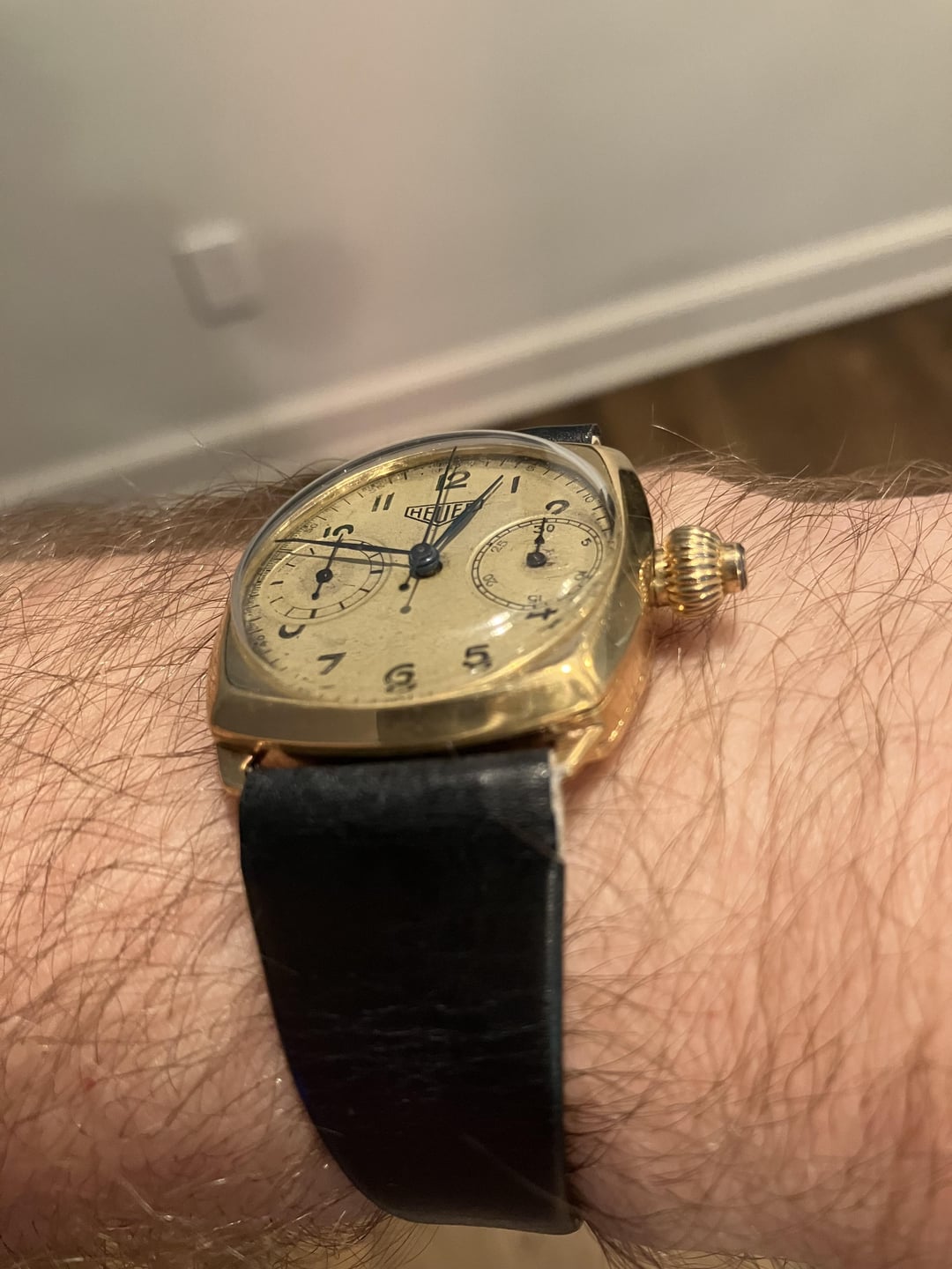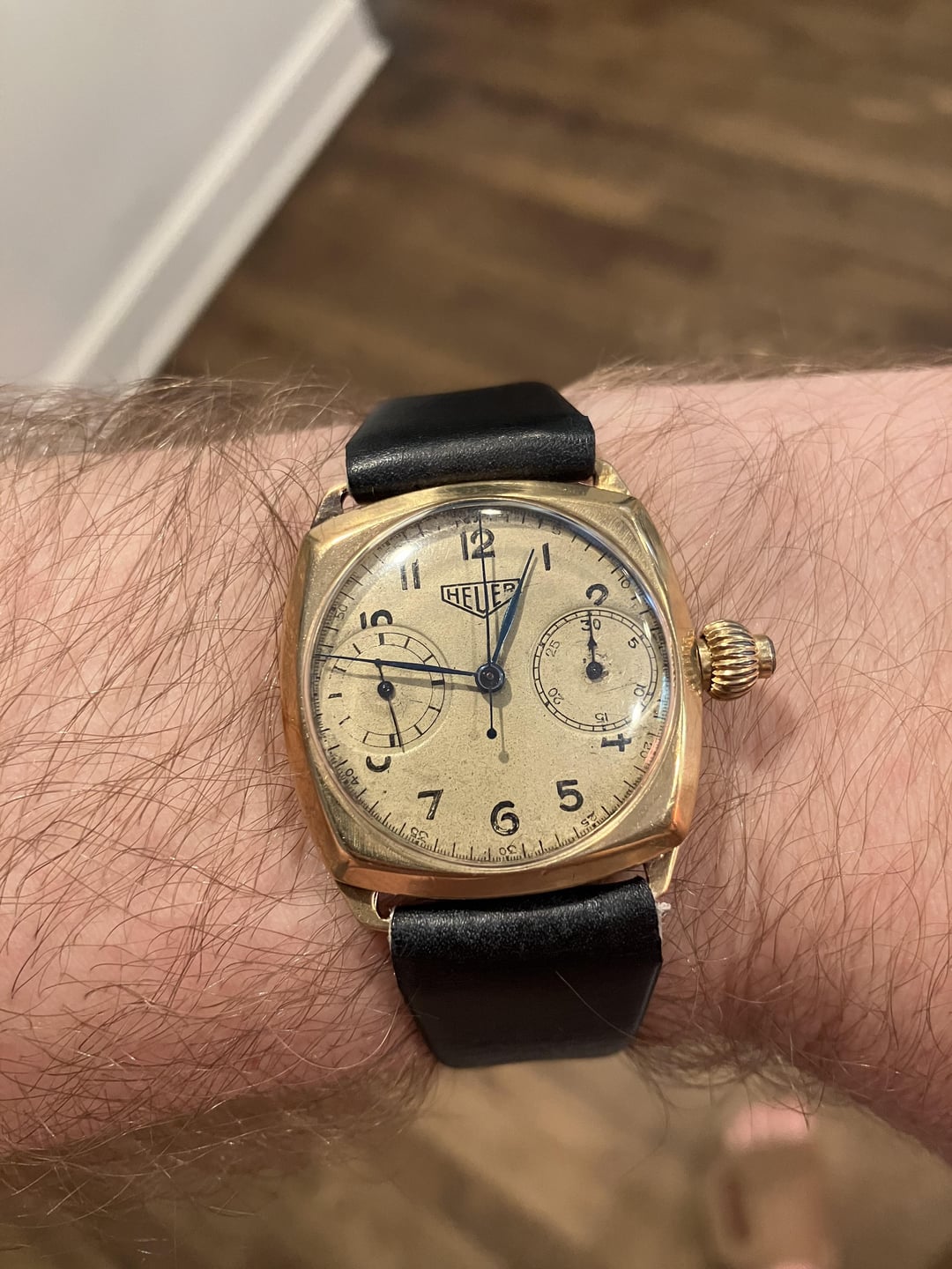 WTS 1932 Heuer Monza monopusher chrono Asking negotiable $3,500 USD + label, shipping from FL. 18k gold case 33mm x 33mm square case SOLID WIRE LUGS - current strap fits my 20cm wrist on the last hole (pictured). 36mm lug to lug distance. Chrono function is working. Running condition but ACCURACY not guaranteed due to the age of the piece. Currently running between -30 and -120 s/d (slower while Chrono running). Service history unknown. Happy to show the watch on FaceTime or send a video Send a chat if interested! PayPal G&S, Zelle, Venmo accepted Thanks for looking!