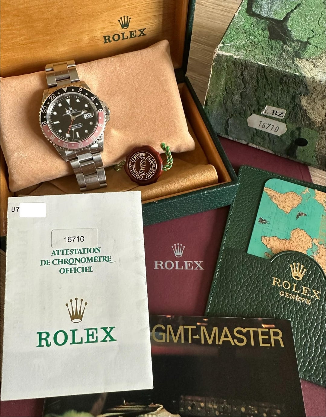 **Rolex GMT Master ref. 16710: $11,300** [Album](https://imgur.com/a/e3MS6vq) | [Timestamp](https://imgur.com/a/OpJTAOM) For sale is a beautiful Rolex GMT Master II reference 16710. This ‘U’-serial watch dates back to 1998, with the original Rolex warranty papers stamped November of the same year. Manufactured during a transitional year for Rolex sports models, this piece left the factory originally with a rare ‘tritinova’ dial - marked ‘T < 25’ for tritium, but fitted with luminova hands and hour markers. The original set is elevated by accompanying date-matching accessories and a beautifully faded serif coke insert. This watch comes as a complete set with original inner/outer boxes (see ‘16710’ sticker on outer box), date-matching GMT Master booklet, 98/99 calendar, leather wallet, chronometer hangtag, and punched Singapore warranty papers with the correct country code dated 1998. The 78790 bracelet has a matching ‘U’ clasp code dating it to be original, correct 501B end links, and 12 links fitting a 7.5” wrist. The watch is in good original vintage condition with a pristine dial, crystal and set of hands. The watch is unpolished throughout and the factory caseback sticker remains intact. The original bezel insert has some light wear that complements the faded color, but no egregious dings or scratches. The bracelet has minimal to no stretch. The watch has signs of use throughout commensurate with its age and untouched condition, but nothing that couldn’t be laser repaired by RSC during service. Please see photos showing condition in detail. Service history is unknown, but the movement operates normally and keeps time within 6 seconds per day. Priced at **$11,300 shipped to CONUS** out of the Seattle, WA 🇺🇸 area. These watches are getting harder to find at a good price with tariffs, this should be the best price in the US for a full set! - Payment via bank wire or Zelle (crypto also okay - USDC/T, or +2%). - Fully insured FedEx Priority Overnight shipping to CONUS included - hold for pickup at a local FedEx Office location required for insurance purposes. - Trades considered (Rolex and Tudor only). Please feel free to reach out with any questions. Buy with confidence - I’m a [well-referenced](https://watchcharts.com/repcheck/reddit/Zippy129/feedback) member of WatchEx for years. Thank you!
