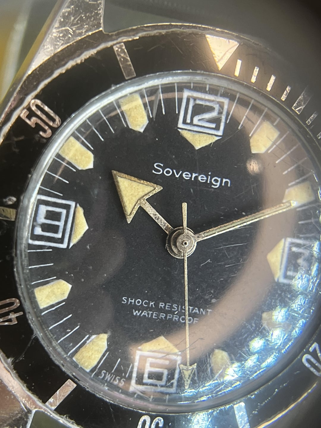 Hi, selling this super unique Sovereign (brand made by Benrus) diver or military style aluminum watch. Yes, this watch has an aluminum case, which is awesome and something I've never seen before. This makes the watch so incredibly lightweight, and it wears so well. Watch is manual wind and comes in around 34-35mm. Lume is doing great holding strong. Comes on this fun forest green NATO type strap. Runs well. Please reach out if you want to see this or any other watch over FaceTime. See all pictures for details and timestamp. Feel free to message, comment, or PM me any questions you may have. Shipping is included in the United States. I accept most forms of major payment. For more vintage watches and first dibs on affordable pieces follow my Instagram at: [Ar.ro.ws](http://Ar.ro.ws)