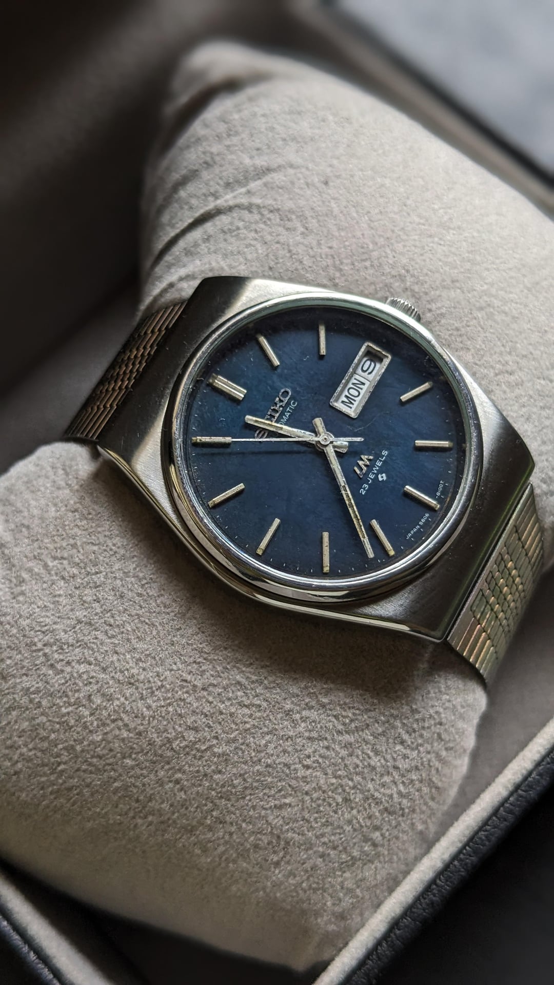 Hello Watchfam, Step back in time with this stunning and highly collectible Seiko Lord Matic 5606-8100, a true testament to Seiko's golden era of watchmaking! Crafted between 1970-1979 *Why the Lord Matic 5606-8100 is a Must-Have*: * Distinctive 1970s Aesthetics: Embrace the unique style of the decade! This model often features a classic cushion-shaped stainless steel case, giving it a distinctive wrist presence that stands out from modern watches. The dial frequently boasts a captivating sunburst finish in a desirable dark blue often complemented by faceted markers and a sleek hand set. * Reliable Seiko 5606 Automatic Movement: At its heart beats the robust and well-regarded Seiko 5606 automatic movement with 23 jewels. This workhorse caliber not only offers automatic winding but also convenient manual winding and a quickset day/date function. For JDM models, you'll often find the desirable bilingual Kanji/English day wheel. It's a testament to Seiko's engineering prowess from that era! * Classic Proportions for Everyday Wear: With dimensions typically around 35-36mm in diameter (excluding crown) and 40-41mm lug-to-lug, and an 18mm lug width, this watch offers a comfortable and perfectly balanced fit for a variety of wrist sizes. It's substantial enough to make a statement, yet elegant for daily wear. * Upper Mid-Range Heritage: The Lord Matic line was strategically positioned by Seiko as a superior offering compared to the popular Seiko 5s, bridging the gap to the revered King and Grand Seiko models. This means you're getting a watch built with higher standards of finishing and attention to detail for its time. Don't miss your chance to own a piece of horological history! The Seiko Lord Matic 5606-8100 is not just a watch; it's a conversation starter, a nod to vintage cool, and a reliable timekeeper ready for its next chapter. Timestamp: https://imgur.com/a/YB2T6V5 Price : 275$ ✔️ FedEx delivery Comment before sending dm